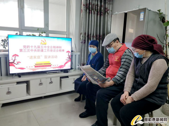 2月9日,“红马甲”志愿宣讲队来到退休老党员娜合什·索来曼家中,与老人一起学习党的十九届五中全会和第三次中央新疆工作座谈会精神,倾听老人的意见和建议。宣讲过程中,娜合什·索来曼认真听,仔细记,她说:“第三次中央新疆工作座谈会是全党全国的大事,是新疆各族人民期盼已久的大事,更是指引全村村民扬帆起航,走向致富道路的‘引航明灯’,作为老党员,我们更要发挥余热,多渠道、多方式让更多的村民知道新疆工作取得的重大成效,让会议精神家喻户晓。”