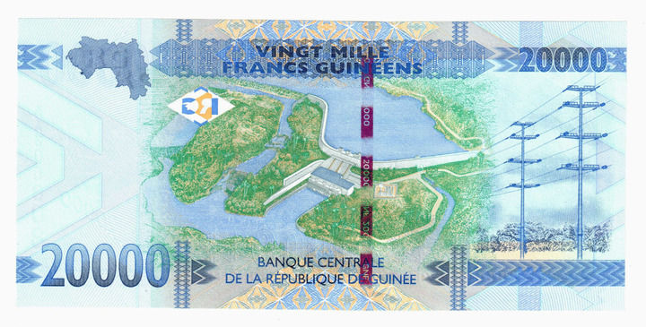 这是印有几内亚凯乐塔水电站效果图的面值2万几内亚法郎的纸币。新华社发