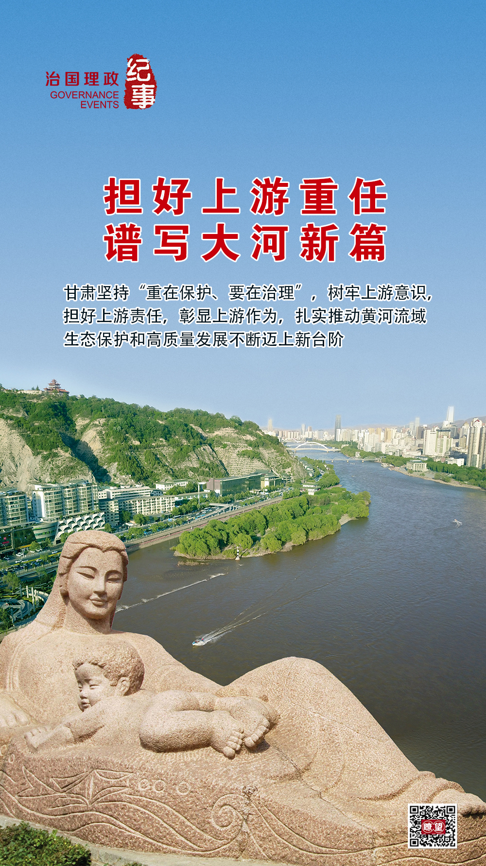 ◇2019年8月,习近平总书记在甘肃考察时指出,保护母亲河是事关中华民族伟大复兴和永续发展的千秋大计。甘肃是黄河流域重要的水源涵养区和补给区,要首先担负起黄河上游生态修复、水土保持和污染防治的重任,兰州要在保持黄河水体健康方面先发力、带好头。