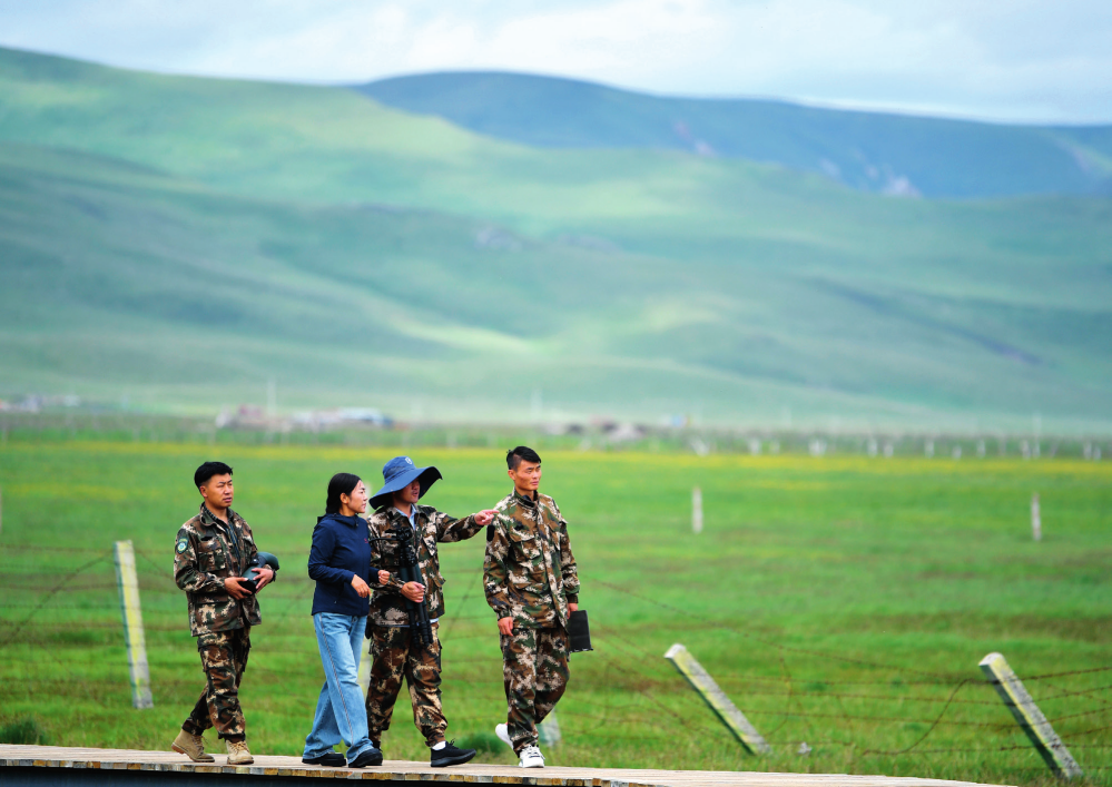甘肃尕海则岔国家级自然保护区管护中心尕海保护站站长香毛吉 ( 左二)和同事在保护区内巡护(2023 年 7 月 7 日摄)陈斌摄 / 本刊