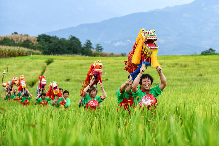 在云南省红河哈尼族彝族自治州个旧市卡房镇的旱地优质稻种植示范区,群众抬着板凳龙在田间穿行迎接丰收季的到来(2024年9月20日摄)。新华社记者 王静颐 摄