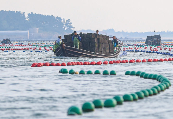 在山东省荣成市爱伦湾海域,鲍鱼养殖户驾驶满载鲍鱼的渔船返回(2024年9月11日摄)。新华社发(李信君摄)