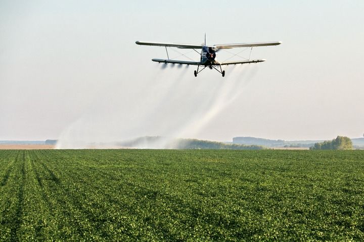 在北大荒集团黑龙江五大连池农场有限公司大豆地块,农用飞机在进行“一喷多促”作业(2024年8月20日摄)。新华社发(陆文祥摄)