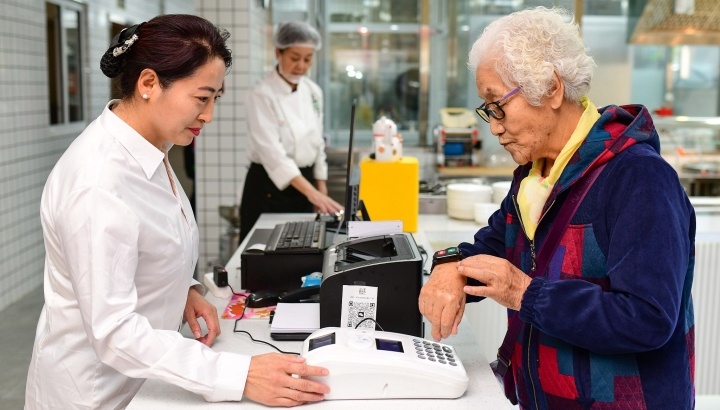 内蒙古鄂尔多斯,一位老人在“邻里食堂”扫码用餐