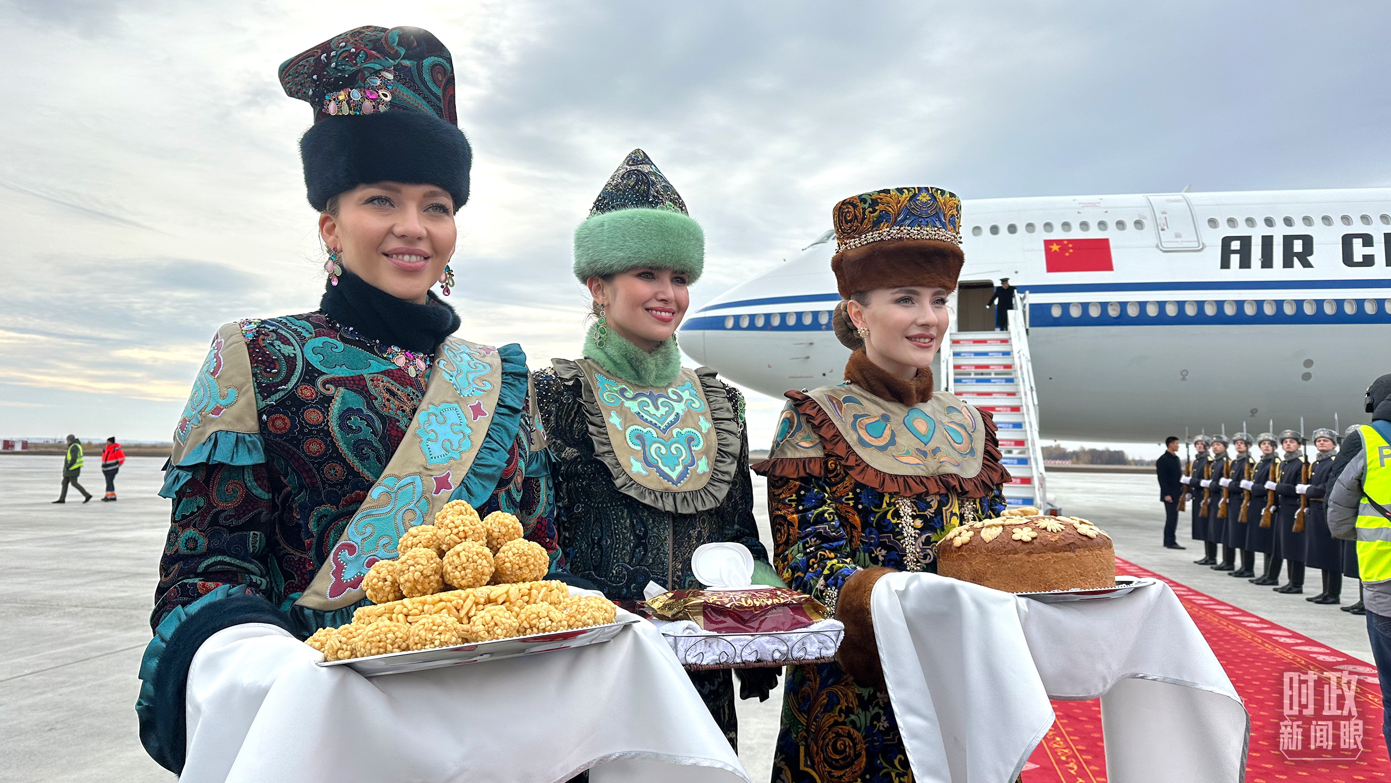 △ 习主席专机抵达喀山国际机场时,礼兵在红毯两侧列队致敬,身着民族服装的俄罗斯女青年用传统礼节表示欢迎。(总台央视记者卢心雨拍摄)