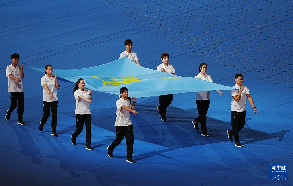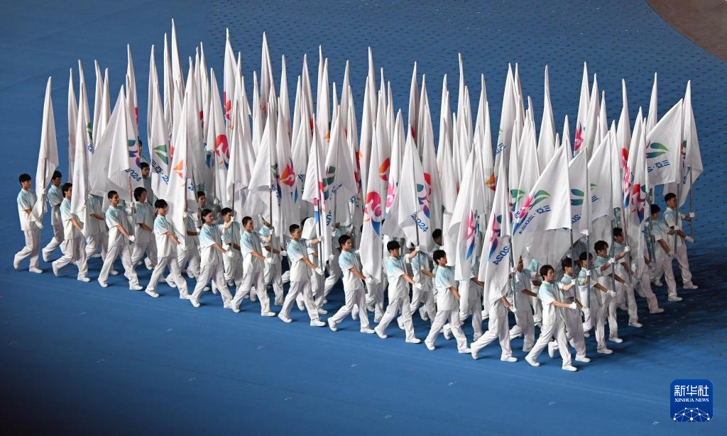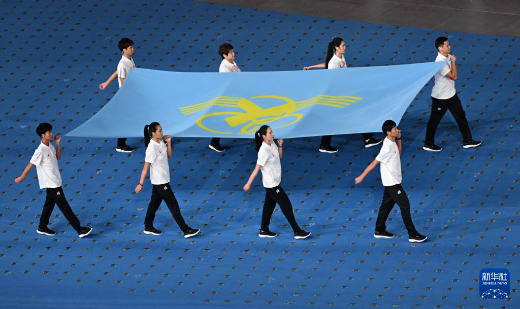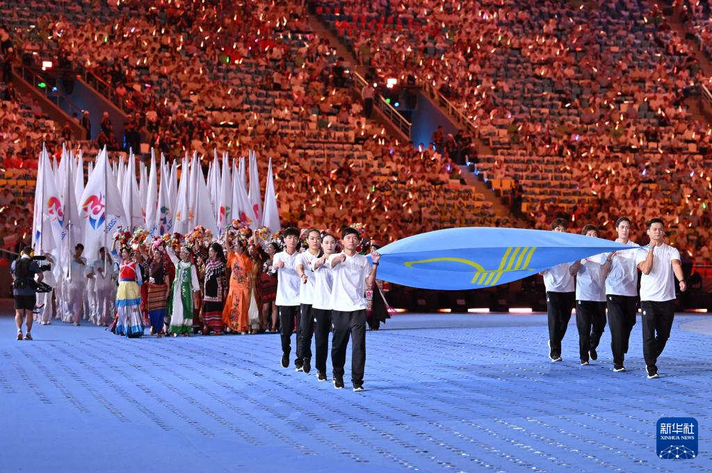 11月22日,中华人民共和国第十二届少数民族传统体育运动会会旗方阵在开幕式上入场。新华社记者 孙凡越 摄