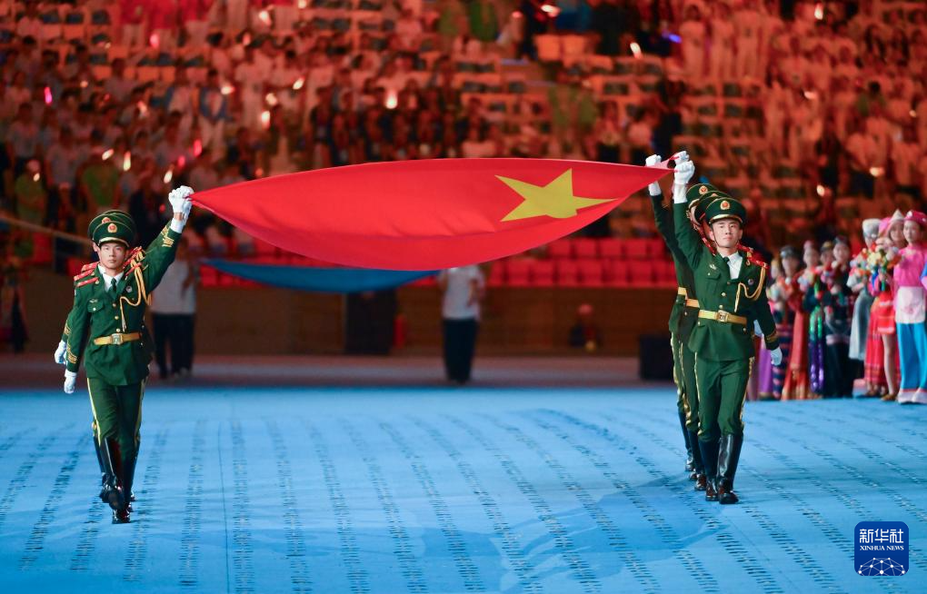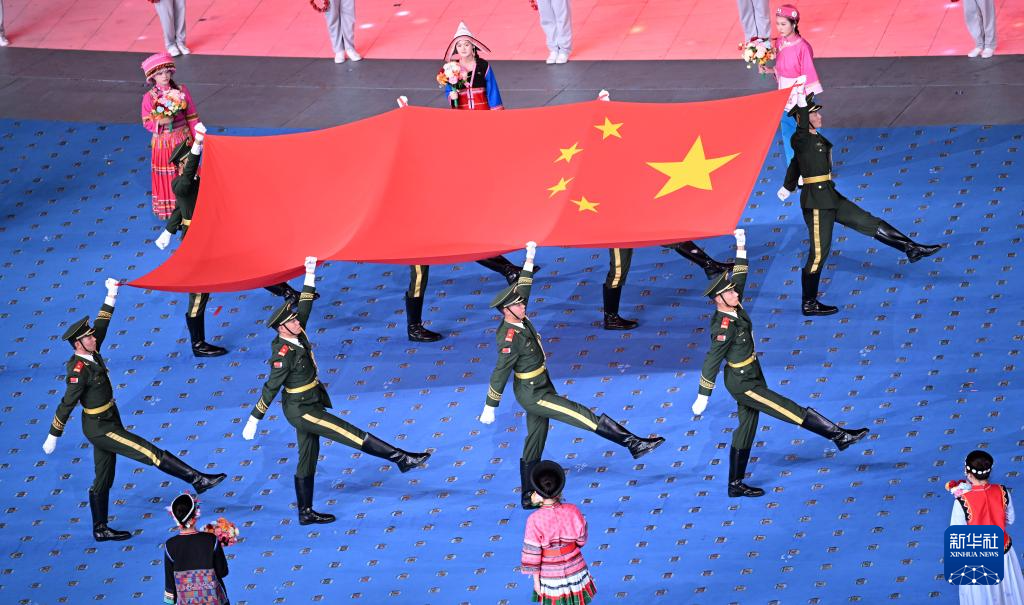 11月22日,中华人民共和国少数民族传统体育运动会会旗在开幕式上入场。新华社记者 张博文 摄