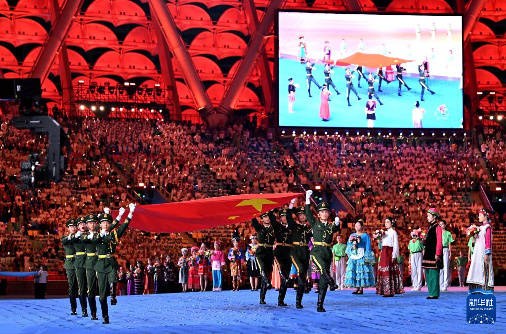 11月22日,中华人民共和国少数民族传统体育运动会会旗在开幕式上入场。新华社记者 胡超 摄