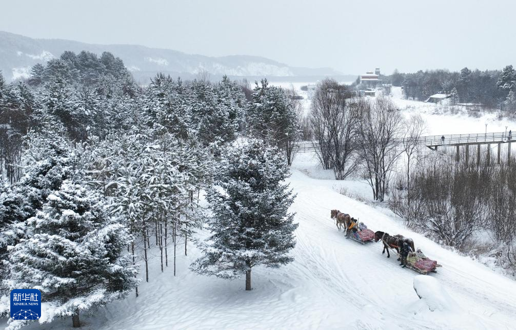 11月27日,游客在漠河市北极村体验马拉爬犁项目(无人机照片)。新华社发(徐率摄)