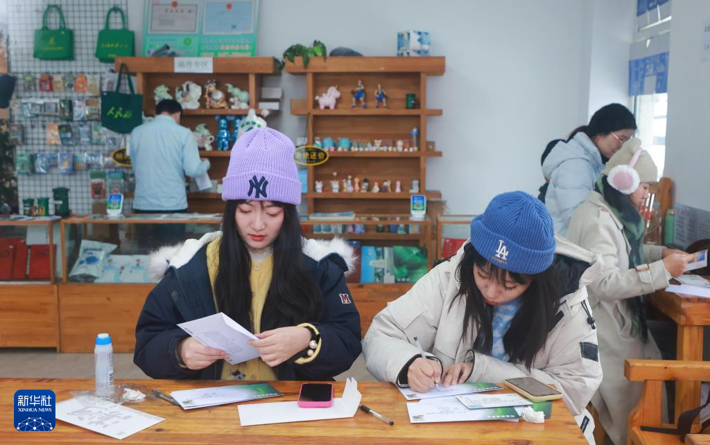 11月27日,游客在漠河市北极村的中国最北邮局填写明信片。新华社发(徐率摄)