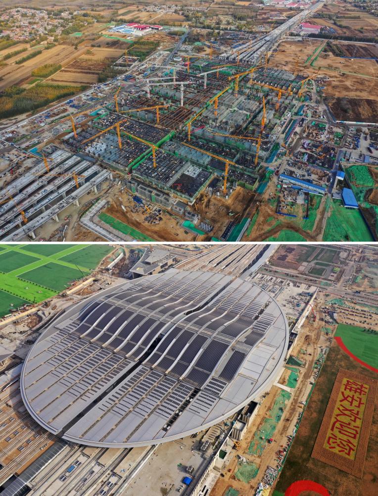 拼版照片:上图为建设中的雄安站(2019年11月7日摄);下图为建成的雄安站(2021年4月1日摄)。新华社记者 邢广利 摄