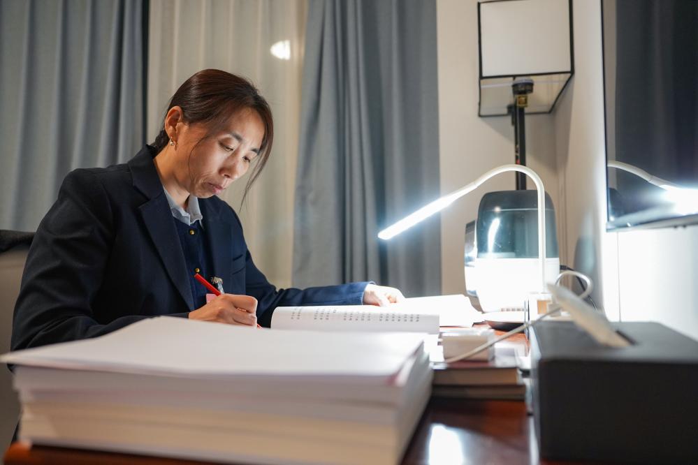 3月6日,郭红静代表在天津代表团驻地阅读政府工作报告。新华社记者 王曦 摄