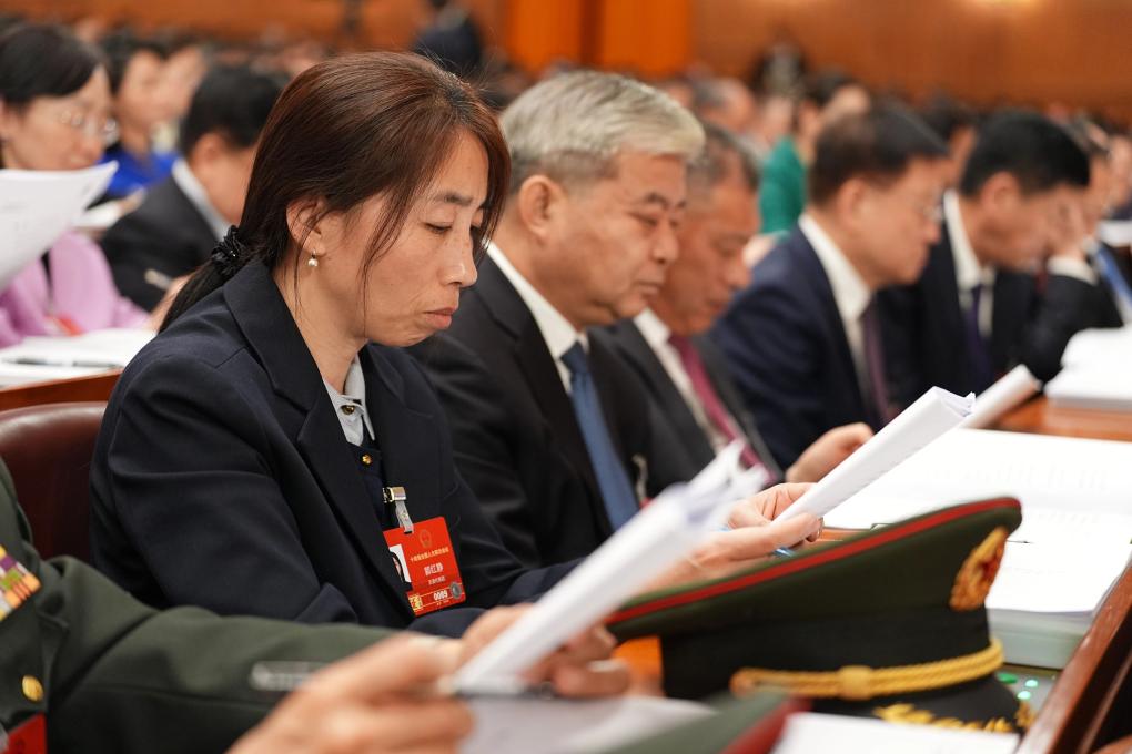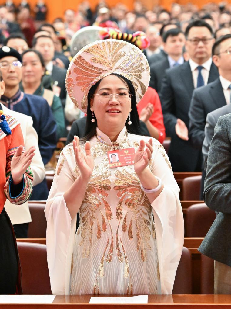 3月5日,张琼丽代表在十四届全国人大四次会议开幕会上听会。新华社记者 邢广利 摄