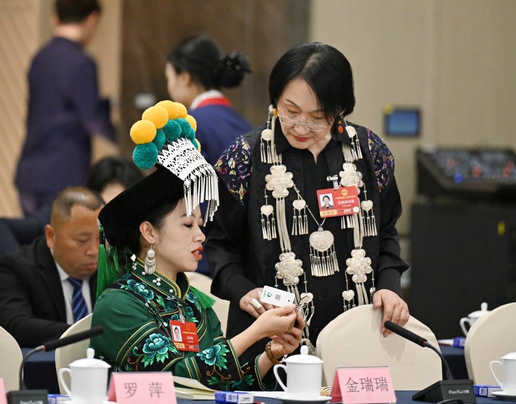 3月7日,金瑞瑞代表(前左)在十四届全国人大四次会议云南代表团开放团组会议前与另一位代表交流。新华社记者 程婷婷 摄