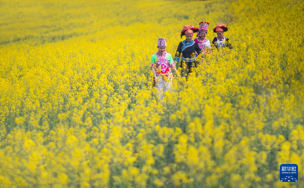 3月8日,人们在云南省文山壮族苗族自治州砚山县阿猛镇下科木村油菜花田游玩。新华社发(熊平祥摄)