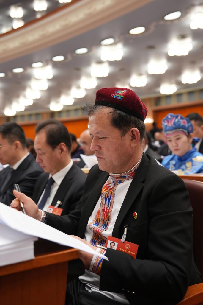 3月5日,全国人大代表木沙江·海拉特出席十四届全国人大四次会议开幕会。新华社记者 邢广利 摄