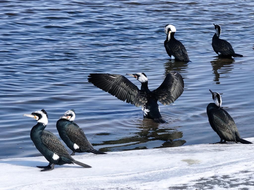 3月11日,在松花江哈尔滨段,鸬鹚在休息、觅食。新华社发(杨威摄)