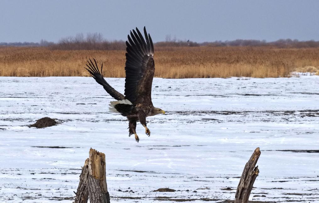 3月6日,在位于黑龙江省鸡西市的兴凯湖国家级自然保护区湿地,白尾海雕在飞翔。新华社发(孙海淇摄)