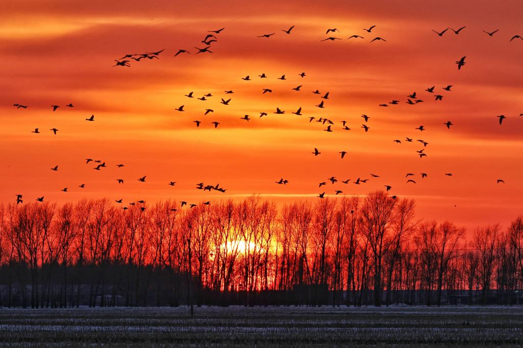 3月15日,在黑龙江省牡丹江市宁安市渤海镇,北归大雁在朝晖中飞翔。新华社发(王宝勋摄)