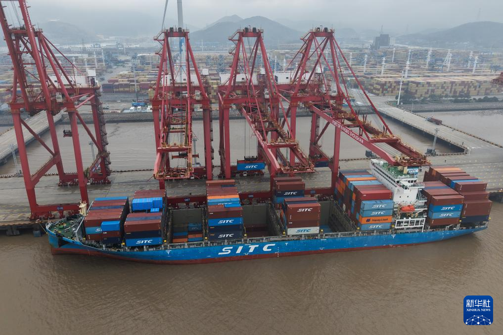 3月29日,货轮停靠在宁波舟山港穿山港区集装箱码头(无人机照片)。新华社记者 黄宗治 摄