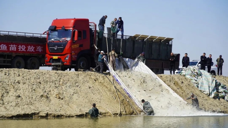 近日,哈巴河县北园春水产经营有限责任公司的员工们迎着朝阳来到基地,将提前放置好的渔网逐一从水中捞起,活蹦乱跳的白斑狗鱼在网兜中不停跳动,一派丰收场景。