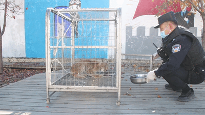 民警找来牧民家捉鸡用的网兜和笼子,小心翼翼将“大猫”兜住,转移到笼子里带回派出所,并给它端来清水和一盘牛肉。嗅到食物的味道,“大猫”来了精神,毫不客气大快朵颐起来。