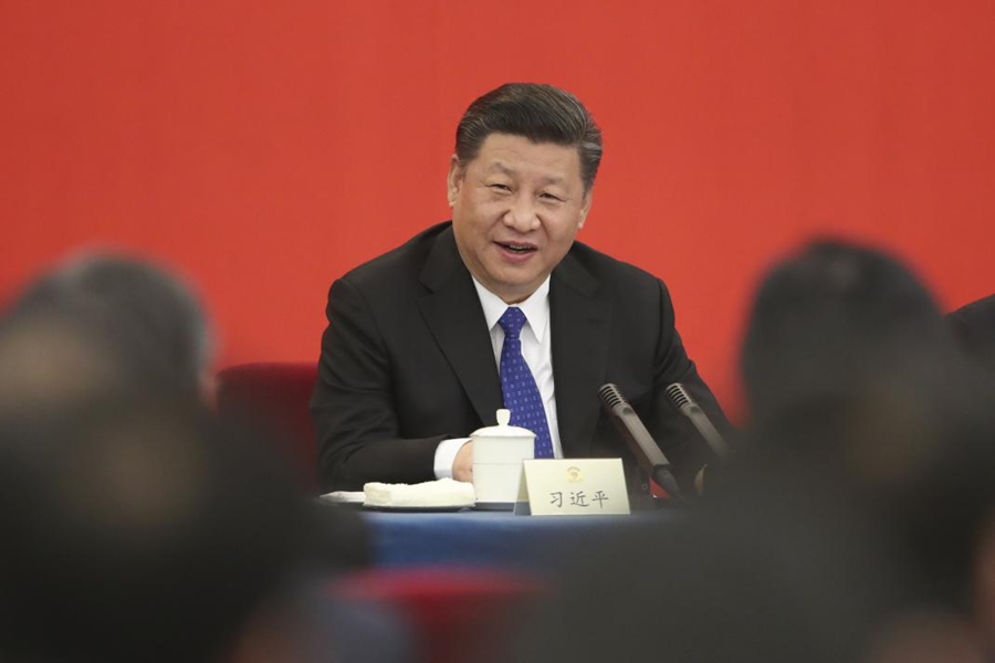2018年3月4日下午,中共中央总书记、国家主席、中央军委主席习近平看望参加全国政协十三届一次会议的民盟、致公党、无党派人士、侨联界委员,并参加联组会,听取意见和建议。 新华社发(盛佳鹏 摄)