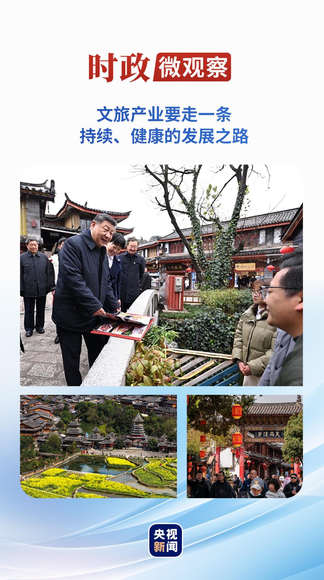 在云南丽江古城,总书记沿着石板路边走边看,与居民和游客亲切交流:“丽江有美丽风光,有特色文化,有很高知名度,一定能走出一条持续健康的文旅发展之路。”他要求当地处理好保护和发展的关系,让这座美丽的古城焕发新的光彩。