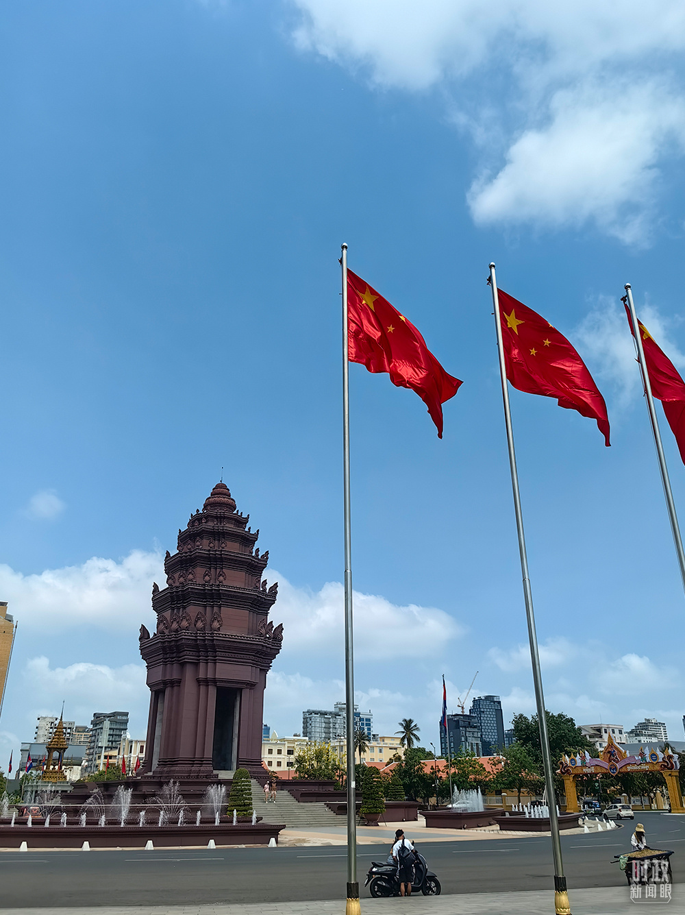 △柬埔寨独立纪念碑前悬挂的中国国旗。(总台央视记者段德文拍摄)