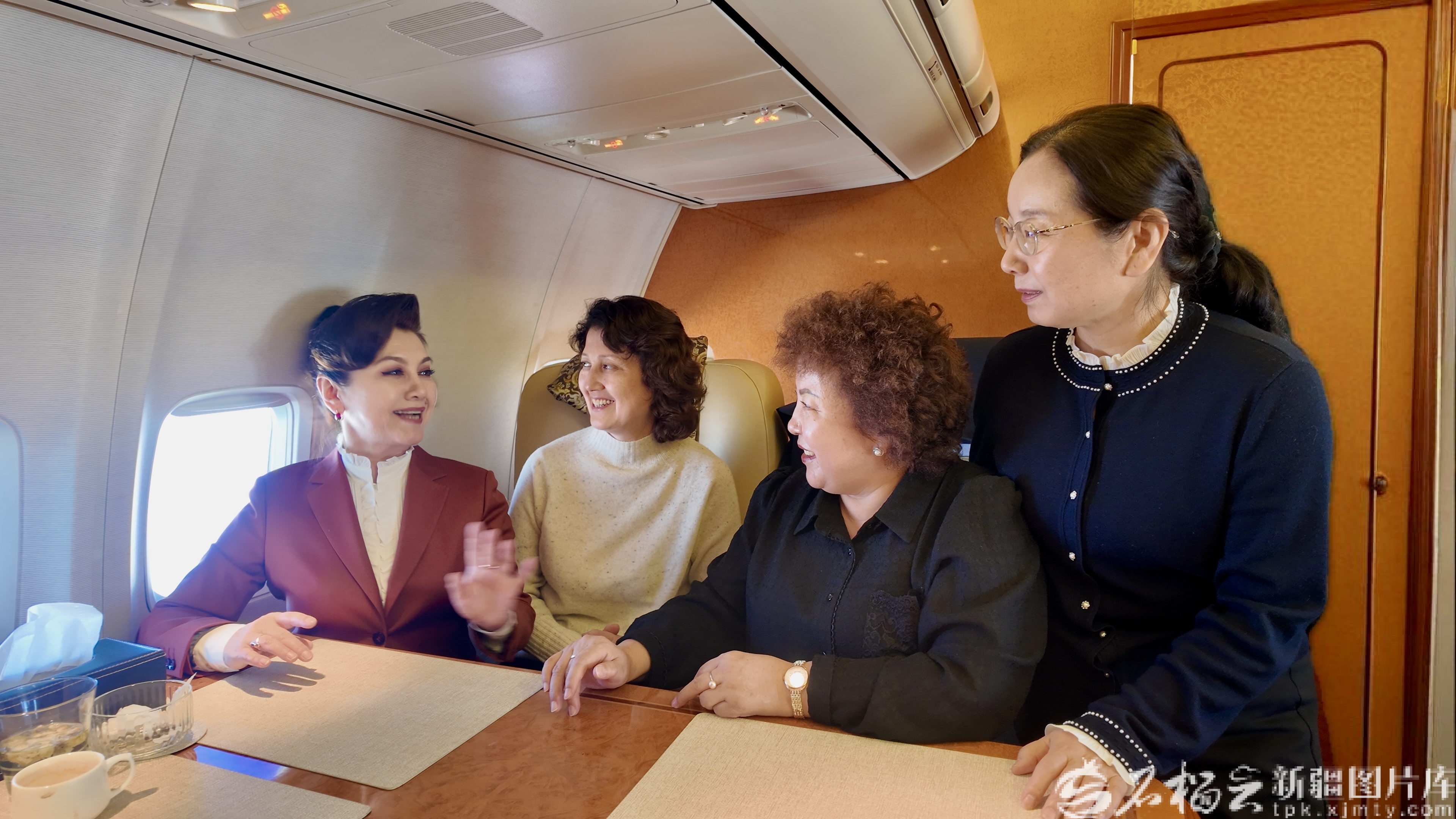 3月3日,出席全国政协十四届四次会议的住疆全国政协委员抵京。图为迪丽娜尔·阿布拉(左一)、木合拜尔·阿布都尔(左二)、阿衣木沙·托合塔洪(右二)、关芳芳委员在前往北京的航班上交流。天山网-新疆日报记者 王昕摄