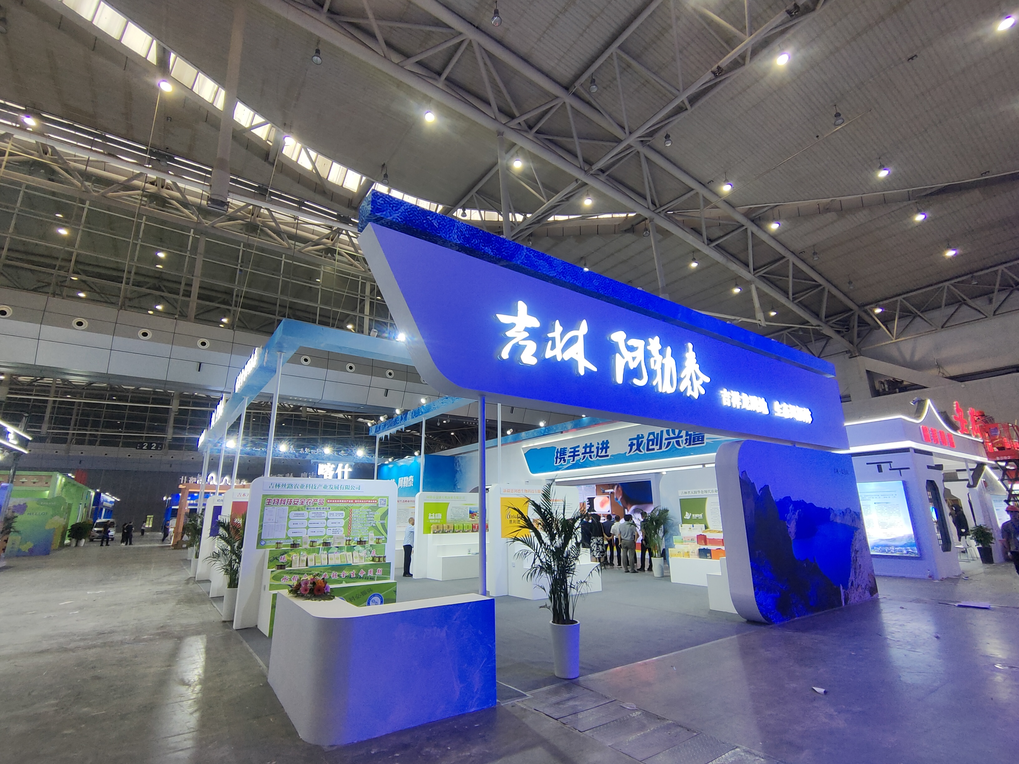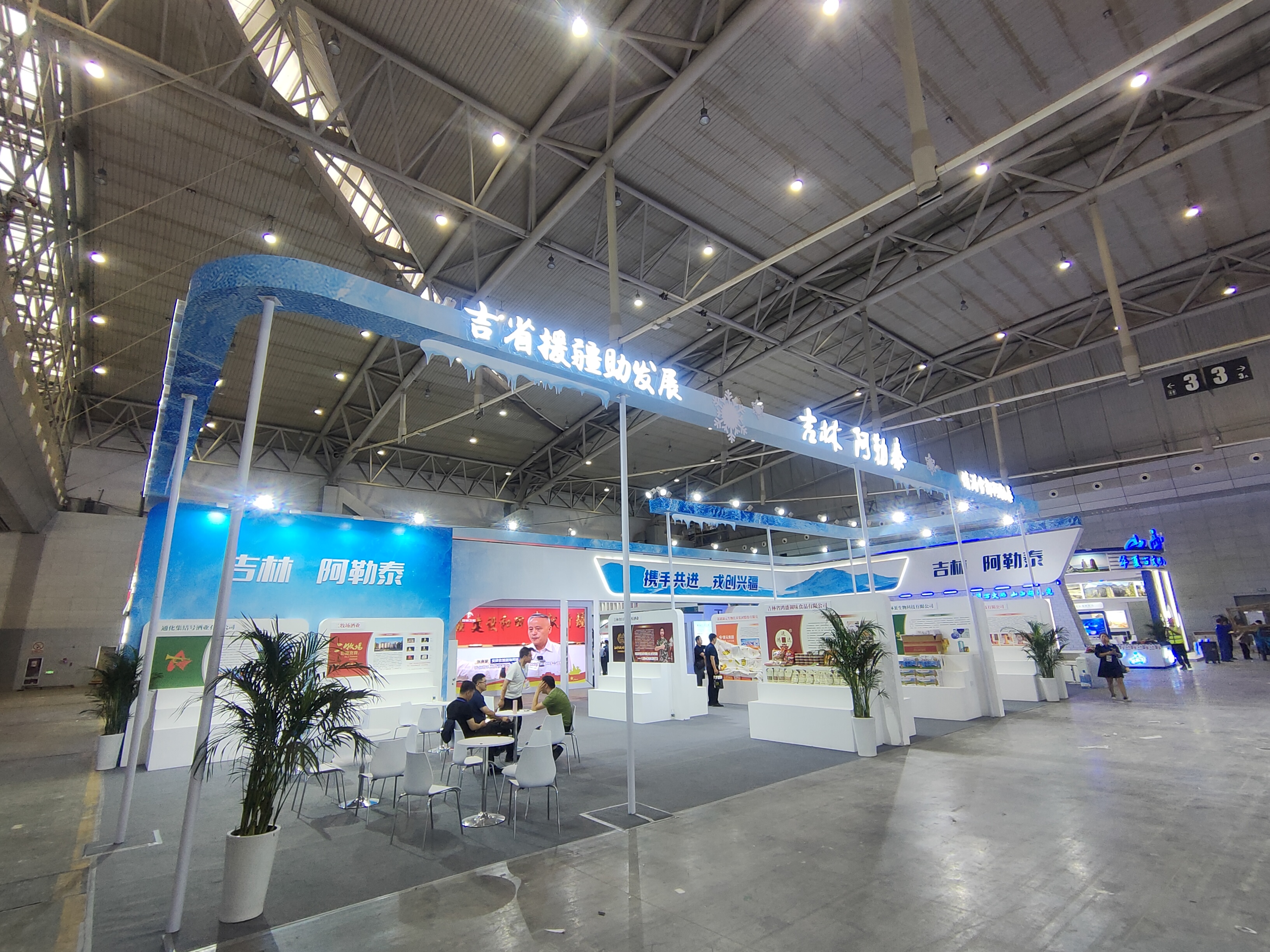 吉林省、阿勒泰地区展位位于国际会展中心三号展厅,展位面积253平方米,以蓝色为主题色彩,融入冰雪元素,凸显两地以“冰雪文化”为核心的属性,在造型设计上凸显简洁、硬朗、有序风格,彰显退伍军人“退伍不褪色”的优良传统。