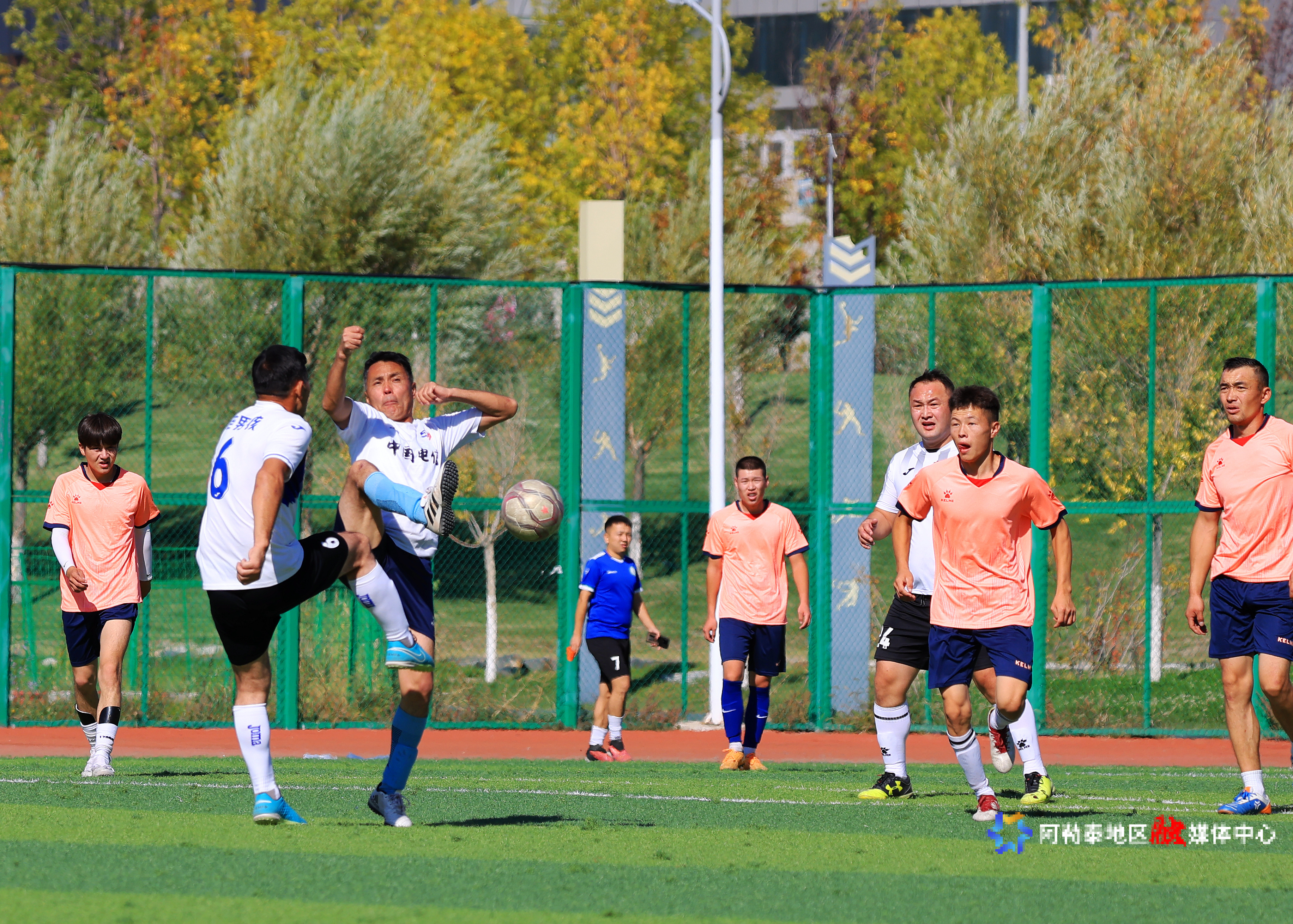 9月20日,参加足球比赛的运动员在进行激烈的拼抢。阿尔达克·拜斯汗 摄