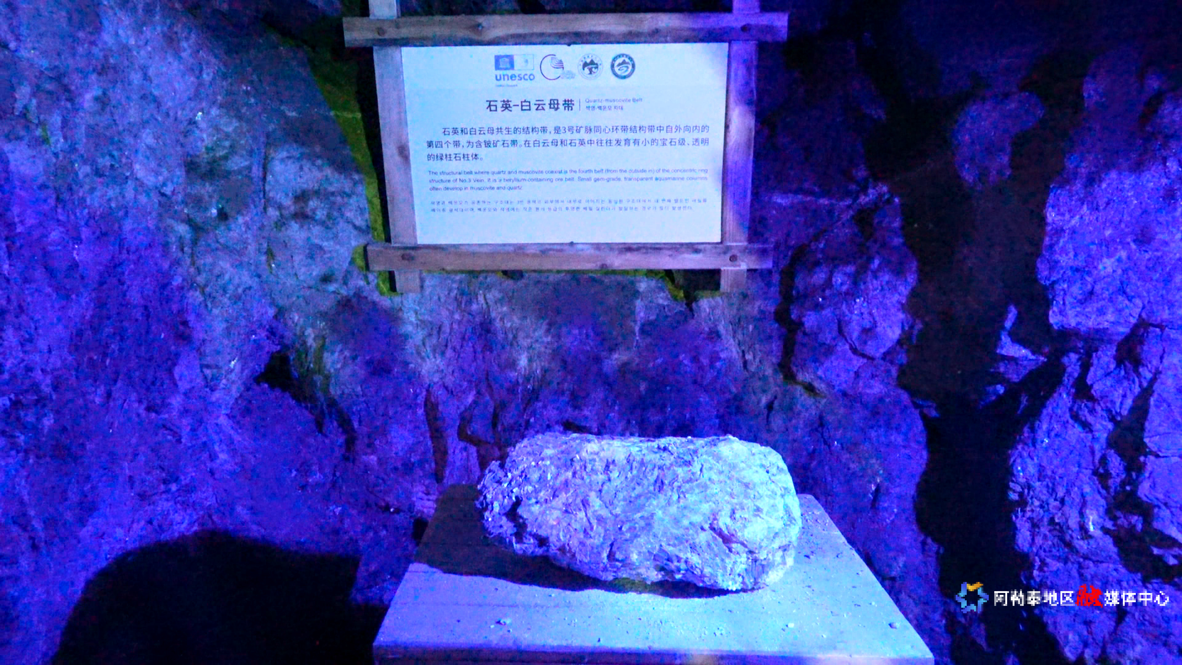矿洞全长800多米,上下分为6层,有大小十几个交叉或相通的采矿室。洞内温度常年为0℃,即使在炎热的夏季,矿洞深处透出的湿风寒气也能让游客阵阵寒噤。矿巷幽深、低矮曲折,却流光溢彩、熠熠生辉。银盘般的云母片光华四射,就像落进了地底的月亮;晶晶闪闪的石英沿壁而生,恍若充满星辰的银河;淡粉的锂辉石、白里透绿的白绿柱石如梦似幻,它们不仅是珍贵的矿产,还是可可托海矿工精神的结晶。