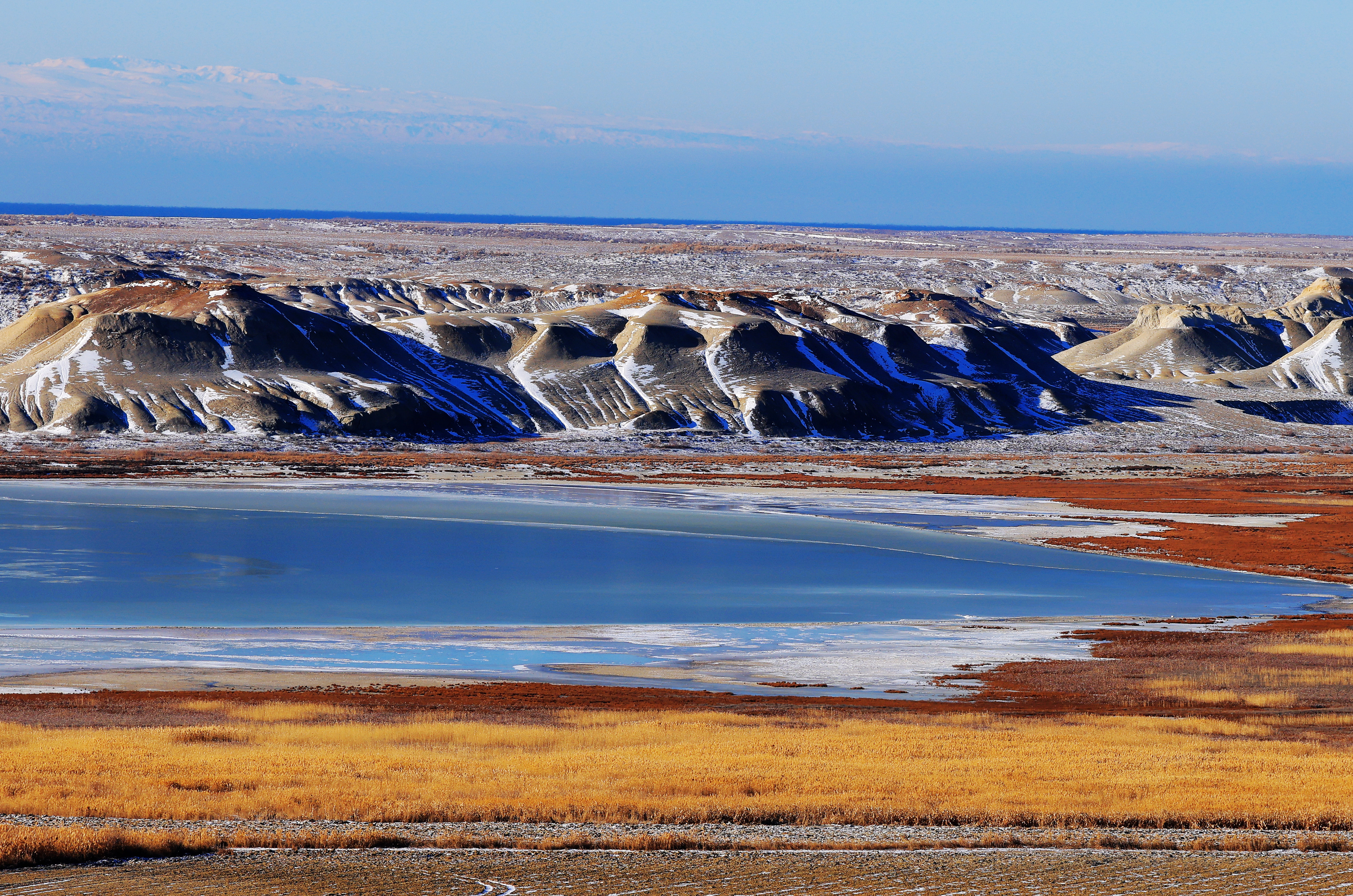 11月27日,福海县乌伦古湖国家湿地公园,湖边的雅丹地貌与皑皑白雪相映成景,宛如画卷。 阿尔达克·拜斯汗 摄