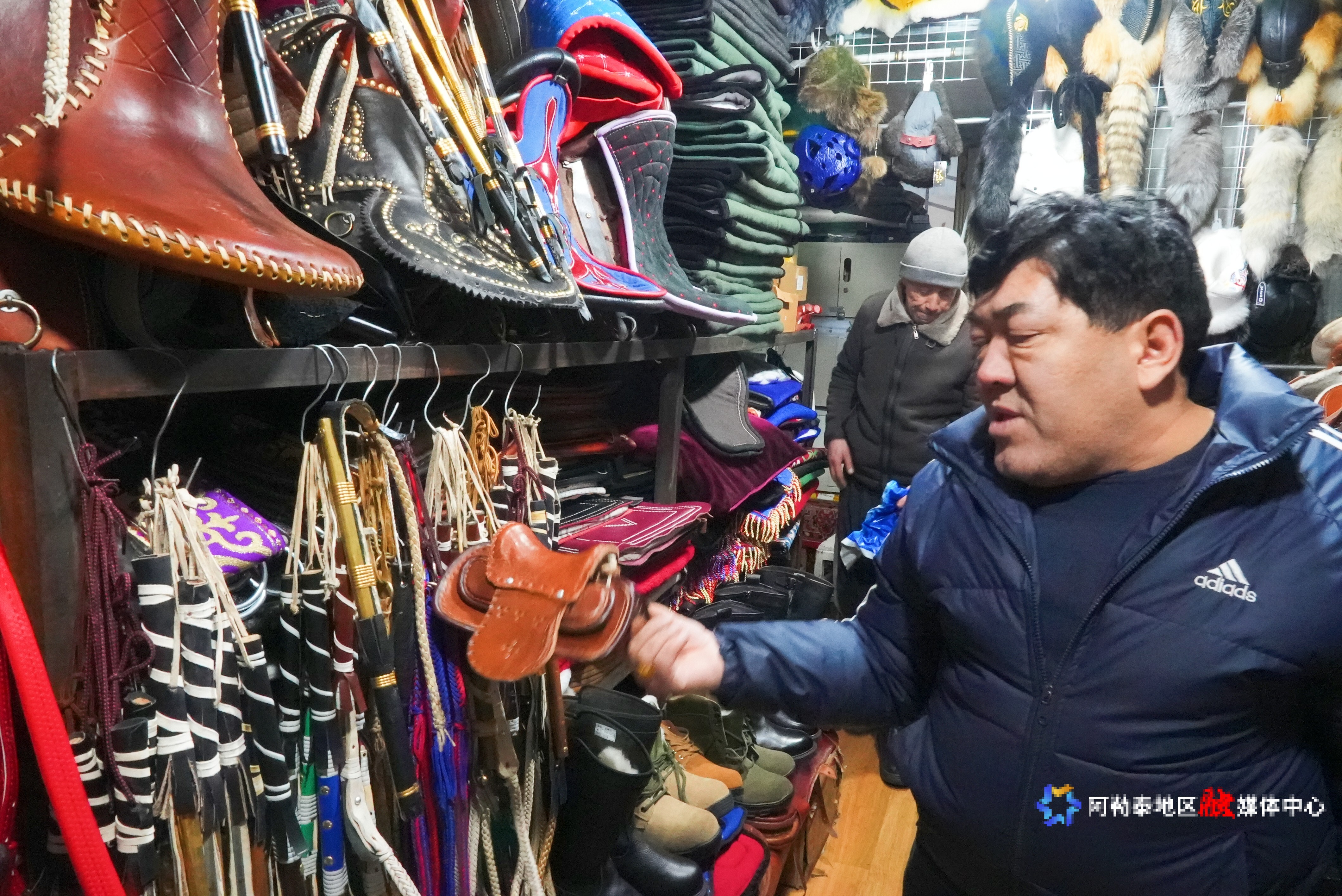 在金山市场内的一家马用品经销店,店主阿布都赛买提·阿吉买买提正在向湖北雪友范亦菲介绍店里相关产品。范亦菲说:“这些马鞭的制作工艺精湛,我打算买一根带回家,挂在家里当装饰,朋友们看到了肯定特别羡慕。”