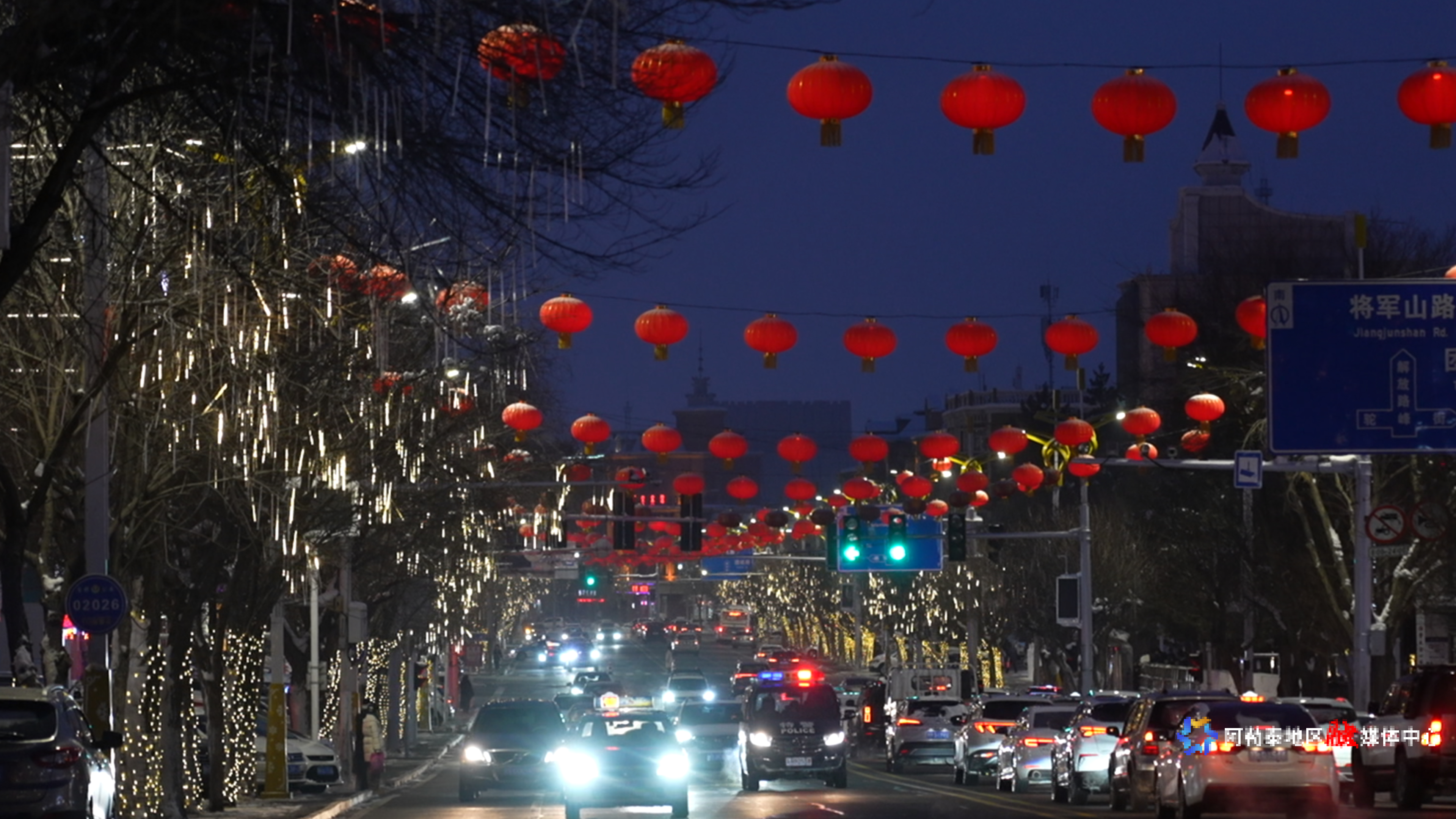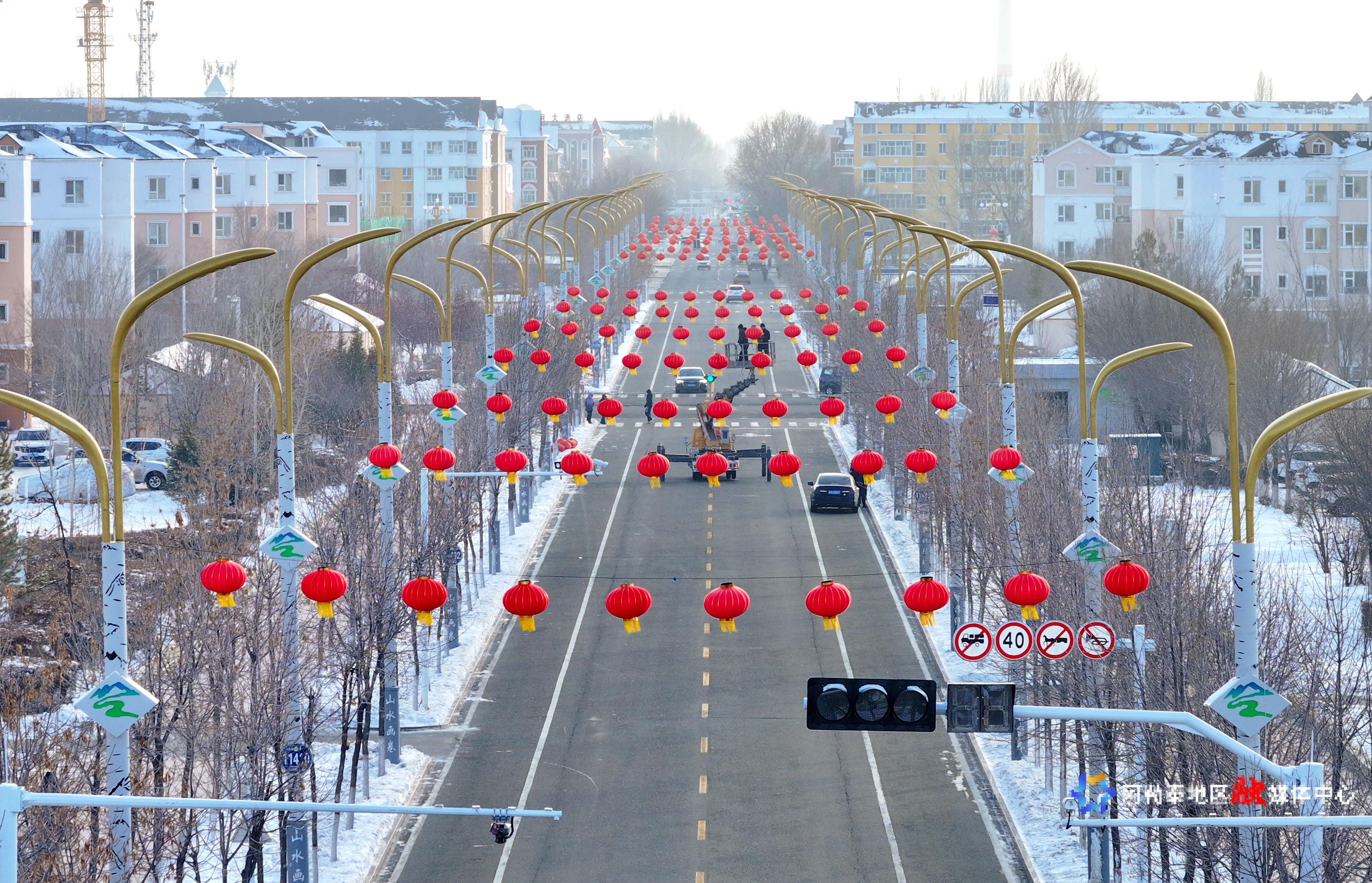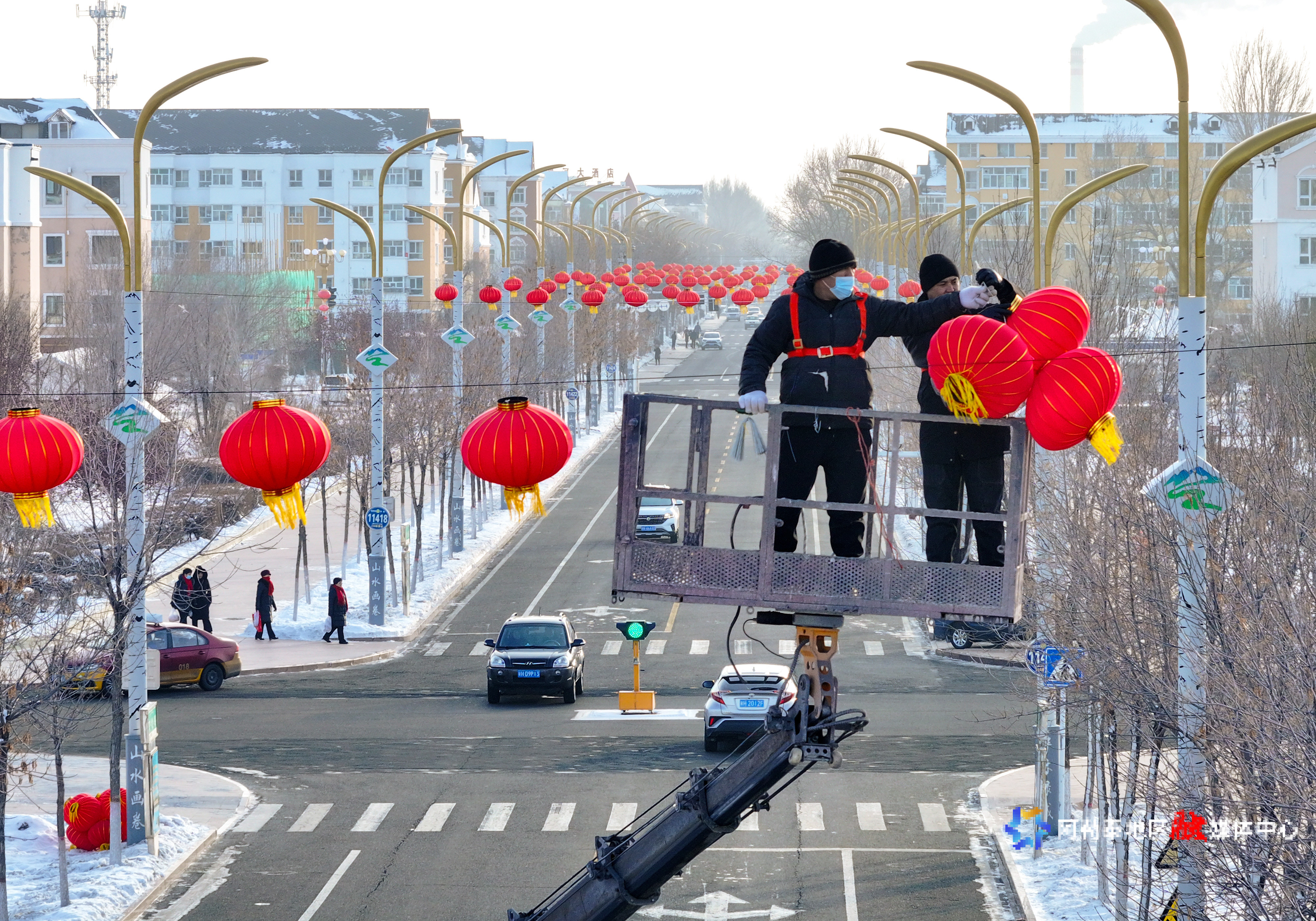 1月9日,在阿勒泰市将军山路上,工作人员正在悬挂流星灯。为即将到来的龙年春节增添一抹亮色。中铁一局阿勒泰建设工程有限公司第二项目部技术员张宇说:“亮化安装工作主要集中在团结路、解放路、将军山路,预计到1月22日全部安装完毕,亮灯时间依据日落情况而定。”
