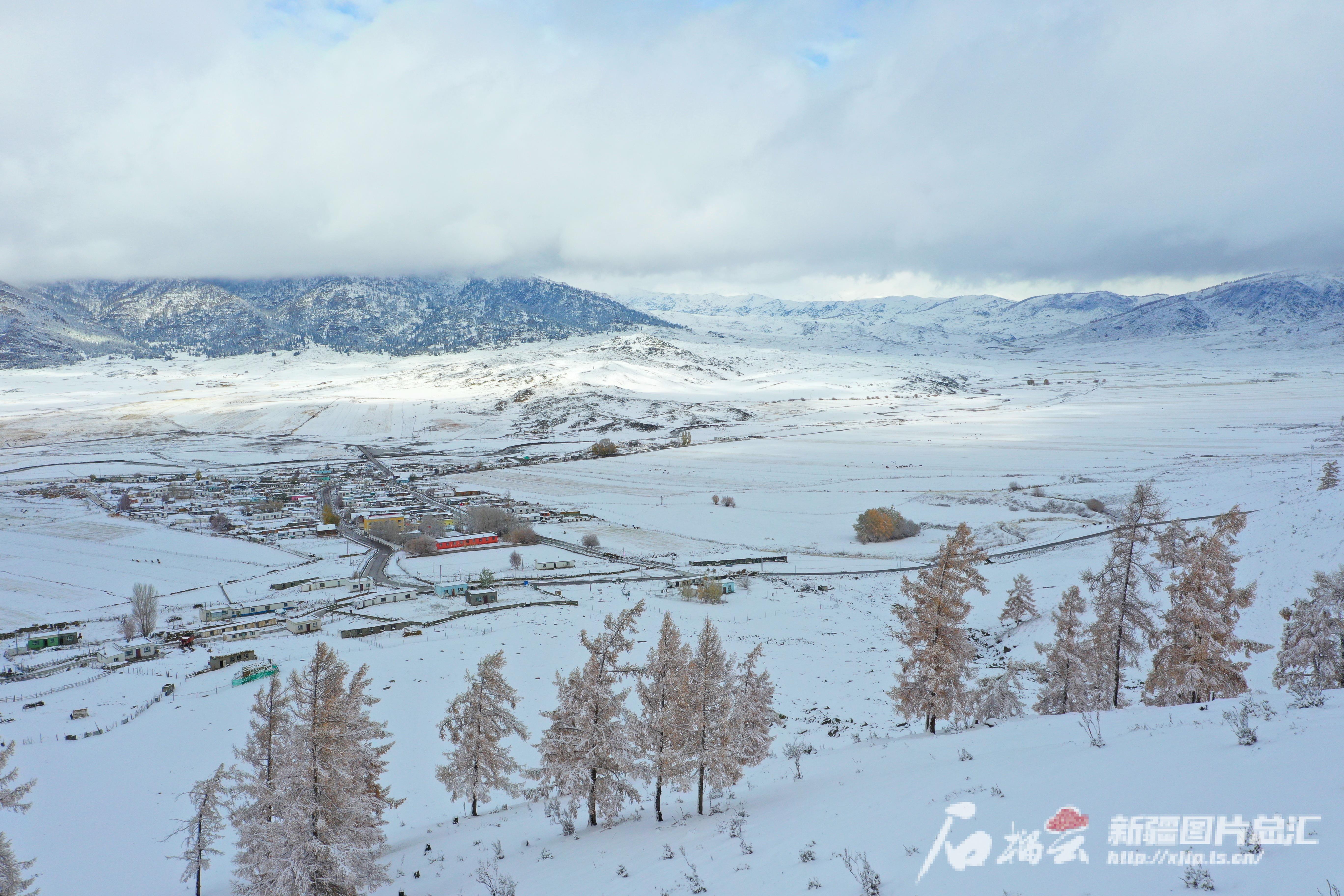 2024年11月7日,俯瞰阿勒泰市切木尔切克镇拜格托别村雪景。刘是何摄