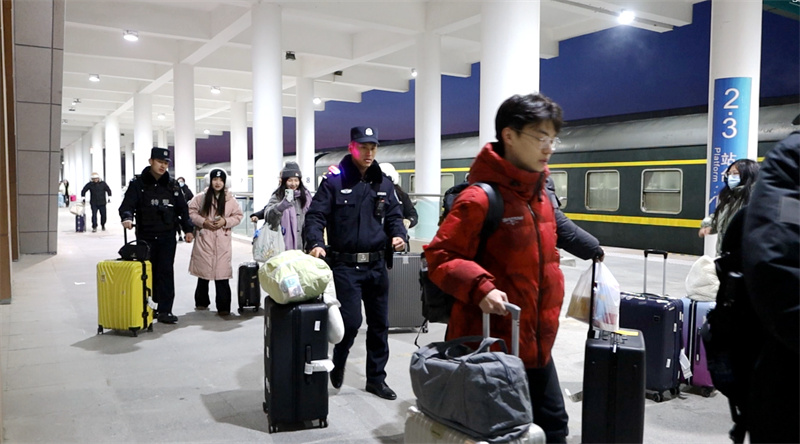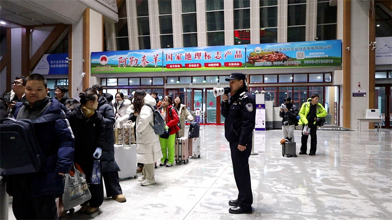 2月4日晚,阿勒泰火车站内,乘坐火车返程的旅客在候车大厅内排起了长队。车站工作人员与乌鲁木齐铁路公安局奎屯公安处阿勒泰站派出所的民警们紧密配合,有序地组织旅客进行检票进站工作。