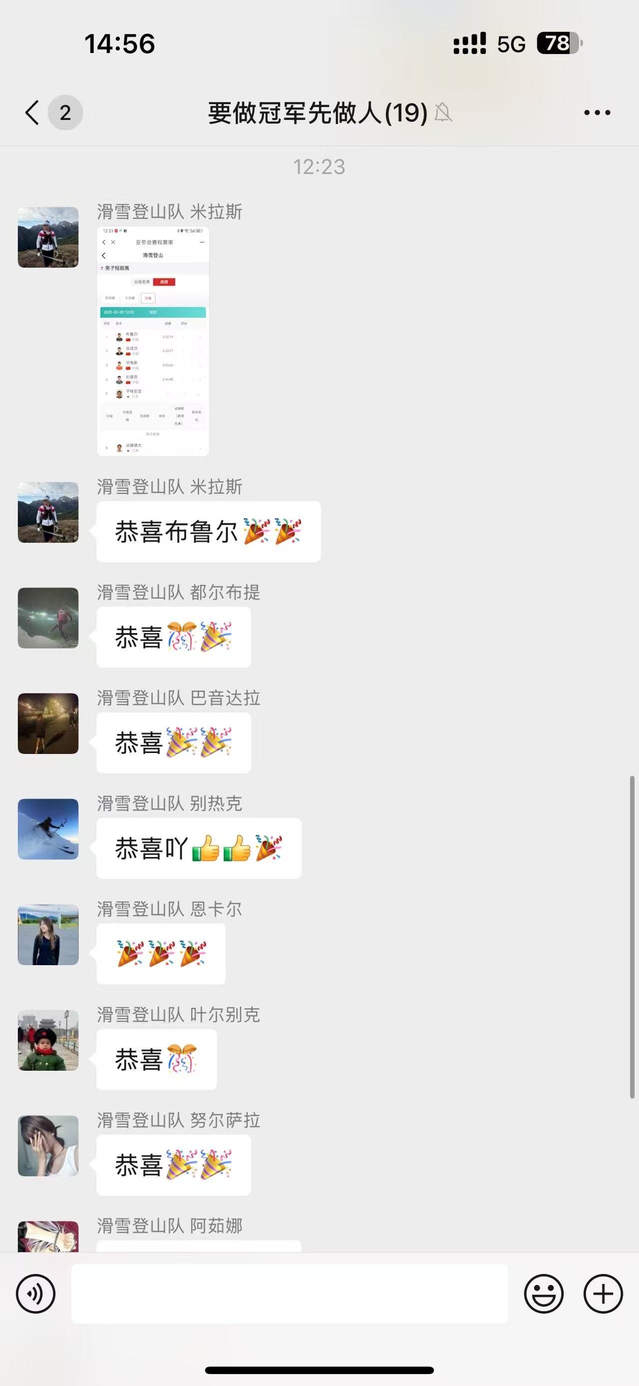 正在吉林省集训的新疆滑雪登山队时刻关注布鲁尔的比赛,夺冠后纷纷在微信群里祝贺。希尔丹截图。