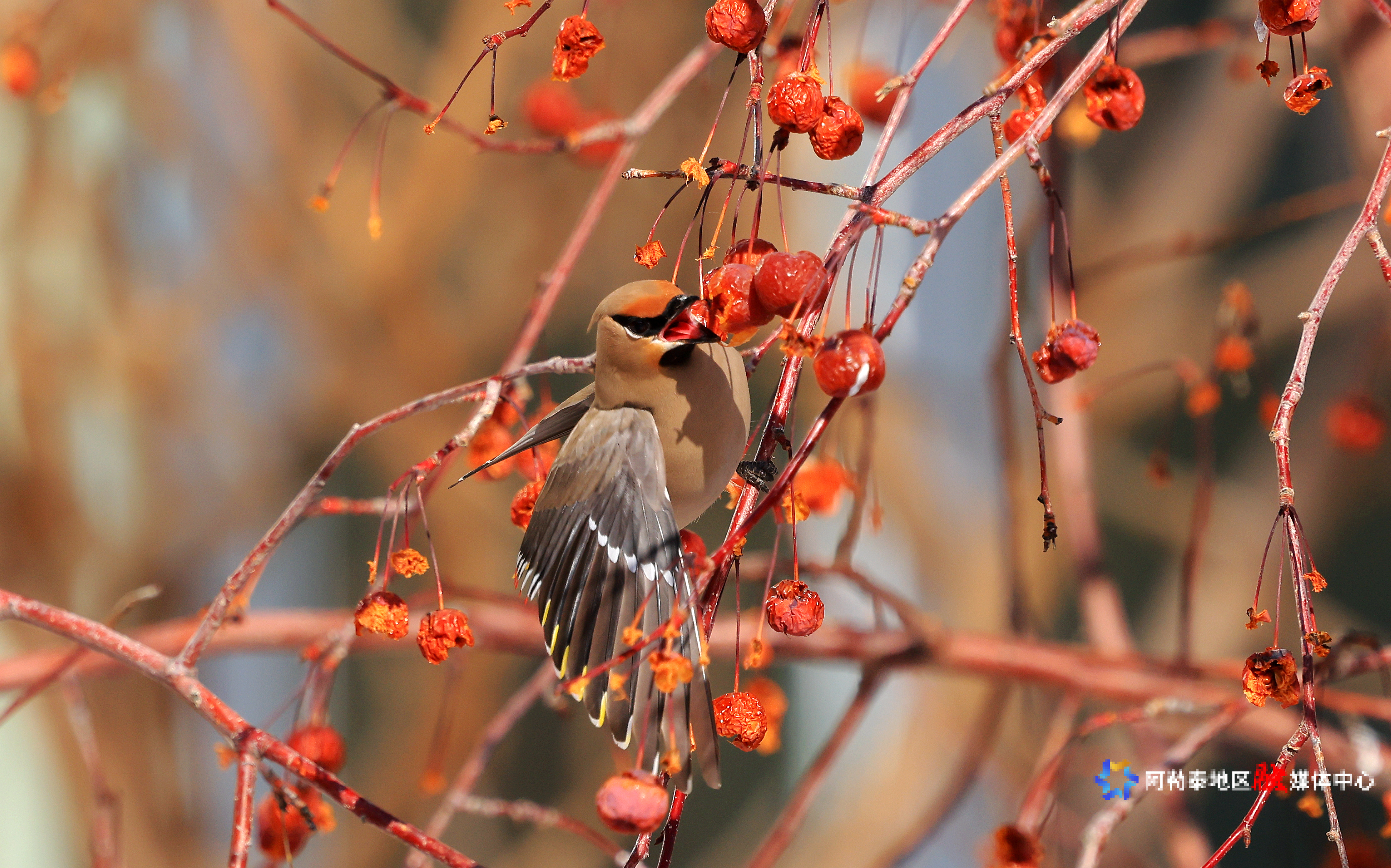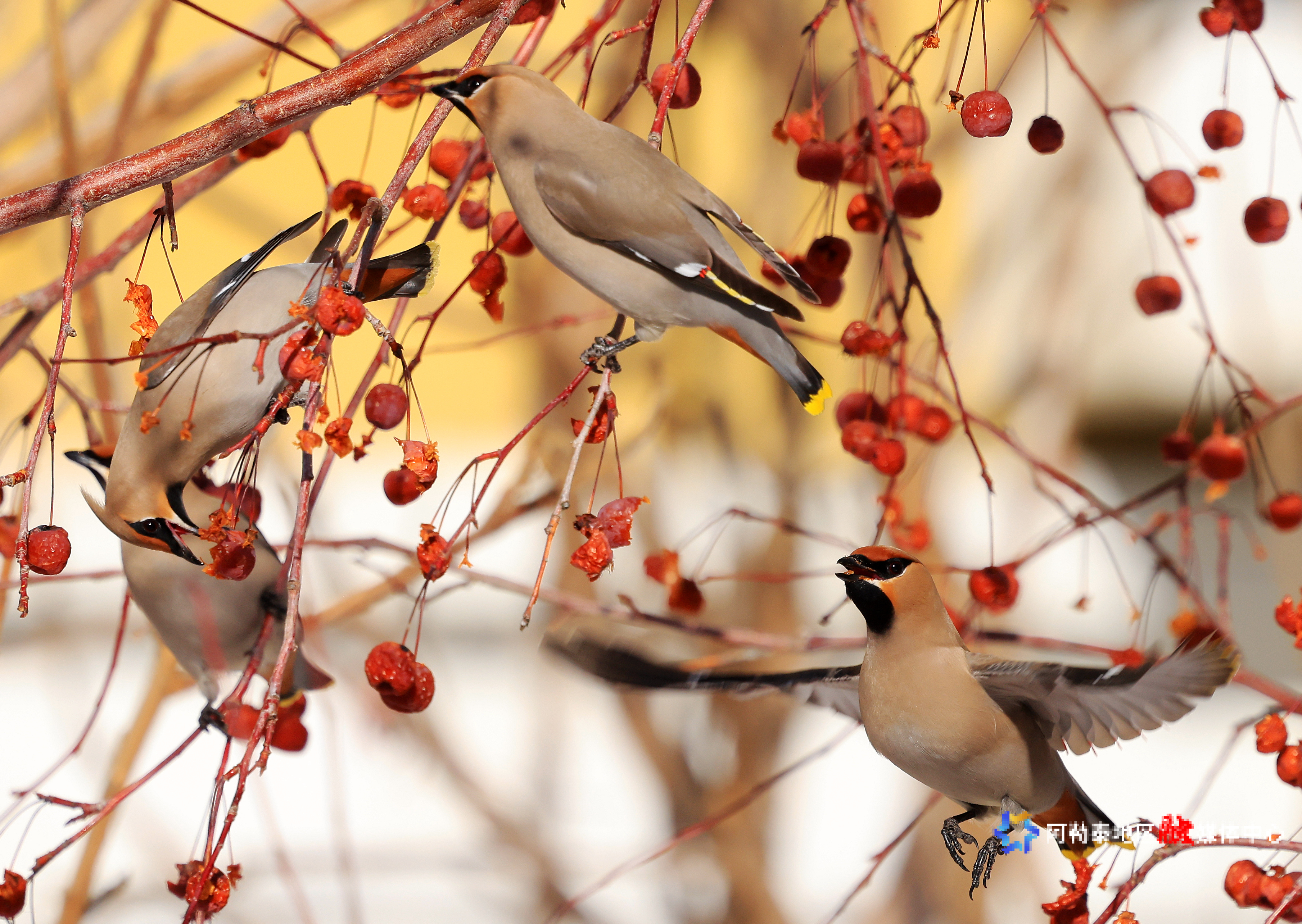 阿勒泰新闻网-阿勒泰地区融媒体中心(记者 阿尔达克·拜斯汗)3月18日,阿勒泰市某小区内,几只太平鸟在枝头飞来飞去,时而啄食红果,时而嬉戏打闹,为阳光明媚的春日增添了一抹灵动与生机。
