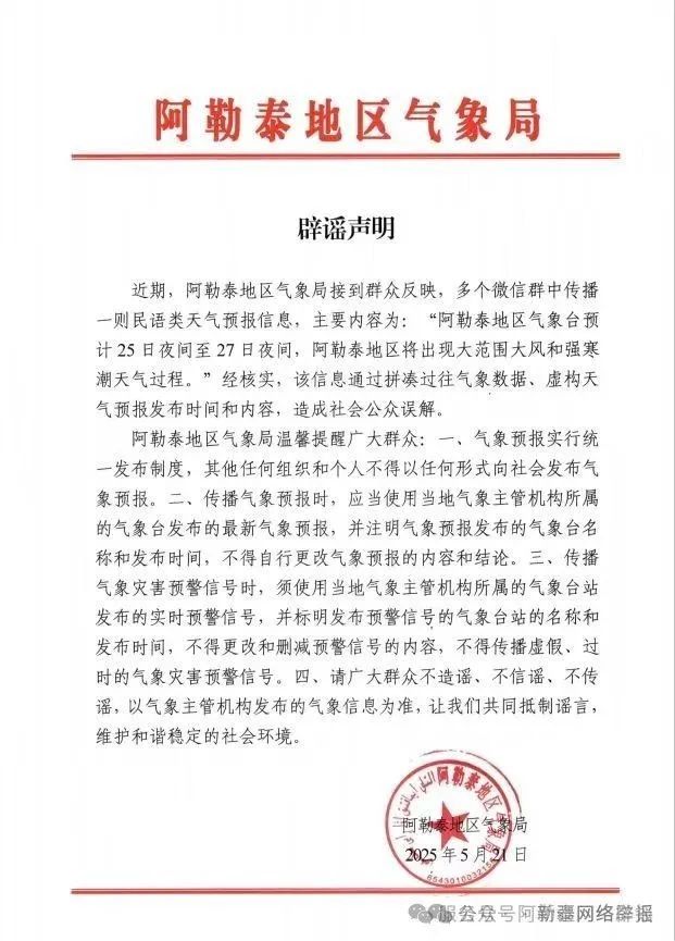 近期,有群众反映,多个微信群中传播一则民语类天气预报信息,称“阿勒泰地区气象台预计25日夜间至27日夜间,将出现大范围大风和强寒潮天气”。经气象部门核实,该信息系拼凑历史气象数据、虚构发布时间和预报内容,属不实信息。