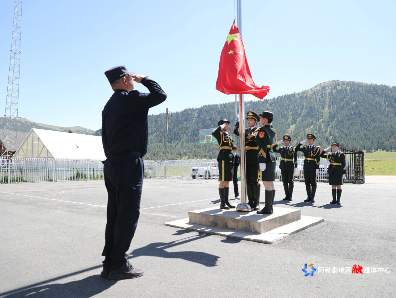 清晨时分,民警、护边员与青年学子们一同举行升旗仪式,随着国歌声响起,鲜艳的五星红旗迎着朝阳冉冉升起。大家神情肃穆,行注目礼并齐声高唱国歌,炽热的爱国情怀与对党的崇敬之情在草原上激荡。