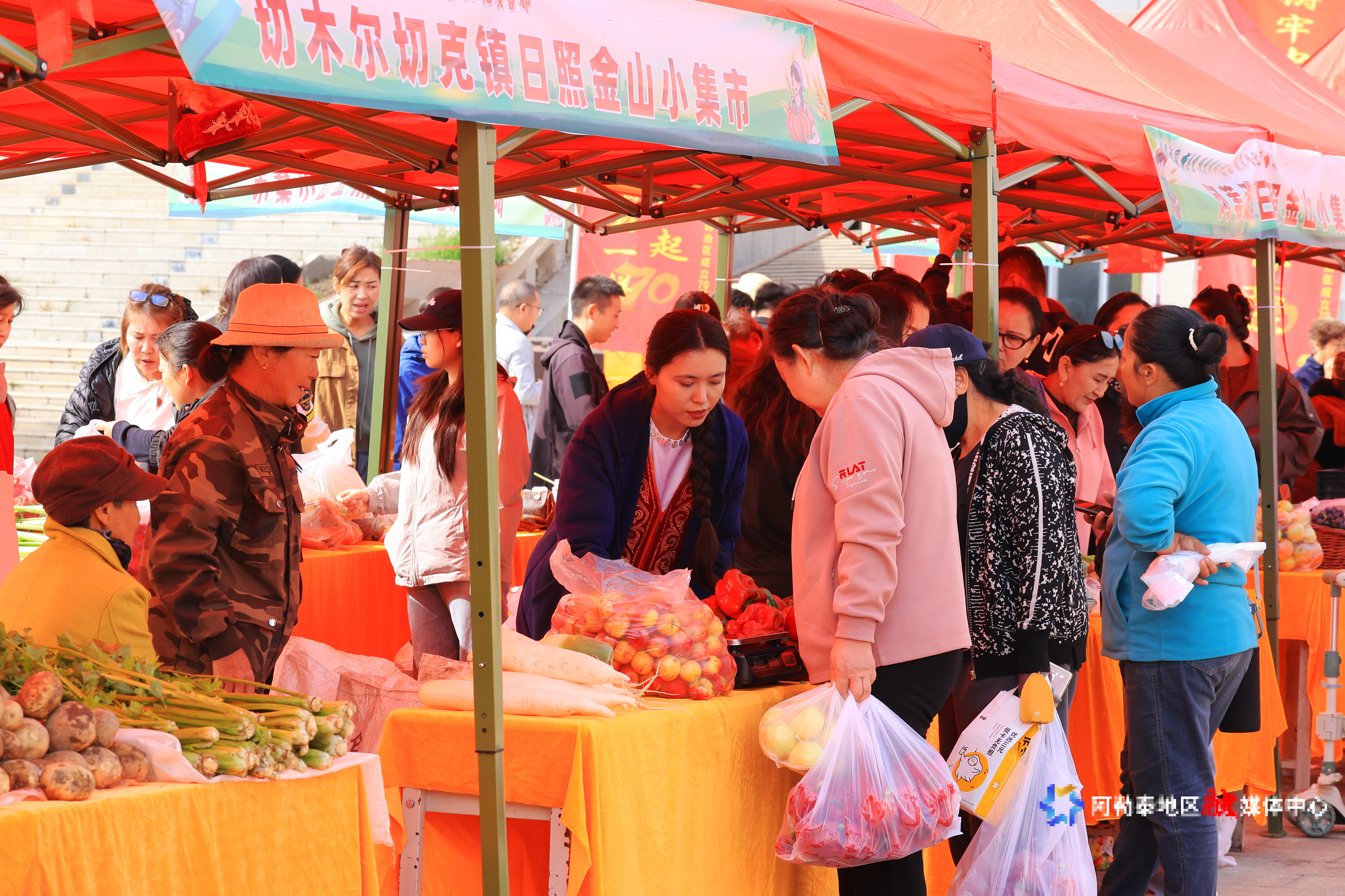 当天,地区体育馆广场热闹非凡。舞台上,各族群众身着特色服饰,歌舞表演轮番上演;展区内,香甜的瓜果、鲜嫩的牛羊肉与精致的手工艺品错落陈列,展示着全年的丰硕成果;美食区内,烤全羊、烤鱼的鲜香弥漫,诱人香气引得食客纷纷驻足。