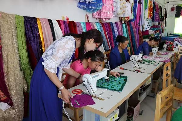 村民在合作社里正在缝纫。