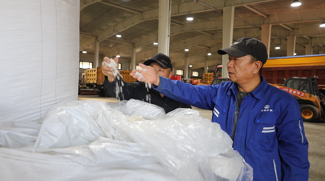工作人员在检查储备的环保型融雪剂,为冬季除雪提供充足物资保障。