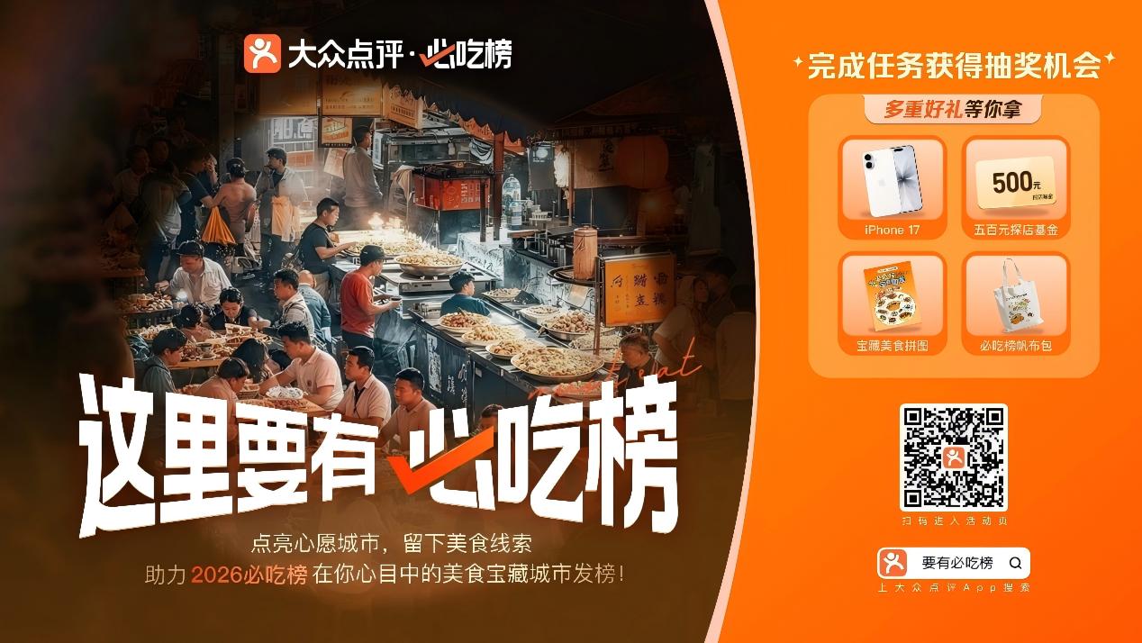 本活动将持续至2025年12月31日。活动期间,用户打开大众点评APP,搜索“阿勒泰要有必吃榜”即可进入活动页面,通过点亮心愿城市、发布美食笔记、撰写评价或打卡餐厅等方式参与互动。参与者不仅能为家乡美食助力,还可参与抽奖,赢取iPhone17、千元珐琅锅、美食拼图等实物奖品,还有机会成为“必吃城市锦鲤”,获得四重专属权益:成为2026年必吃榜新发榜城市美食宣传片嘉宾、获邀参加2026年必吃榜发布会、获取“必吃榜·城市领吃计划”全年直通pass卡、500元美食探店基金。