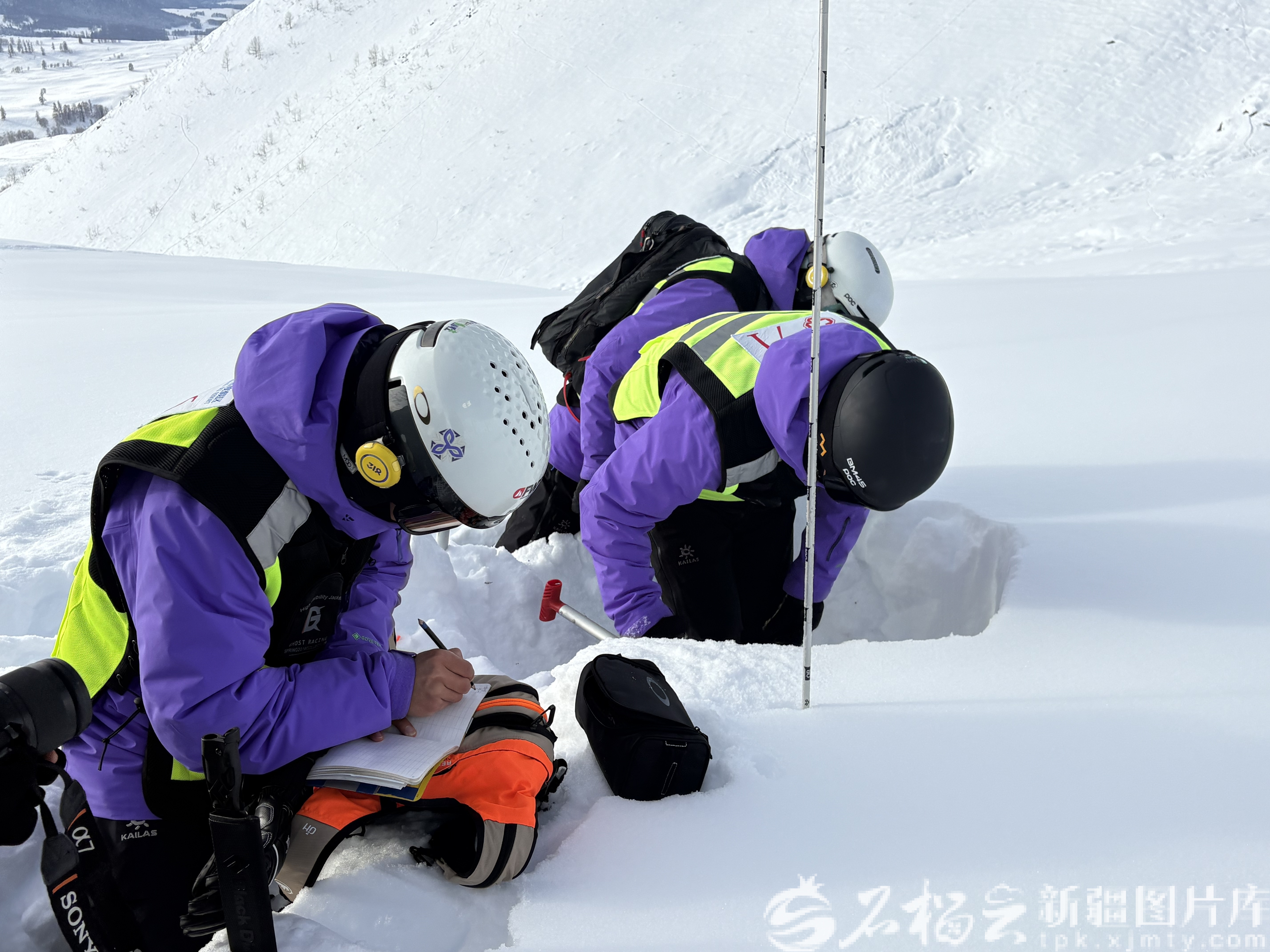 1月7日,夜里的一场小雪过后,天还未全亮,禾木吉克普林国际滑雪度假区的巡救员李世杰,就和队友们背着雪铲、探杆和记录板,滑向道外区,先用铲子小心修整出垂直的雪壁,再对雪层进行分析和记录。