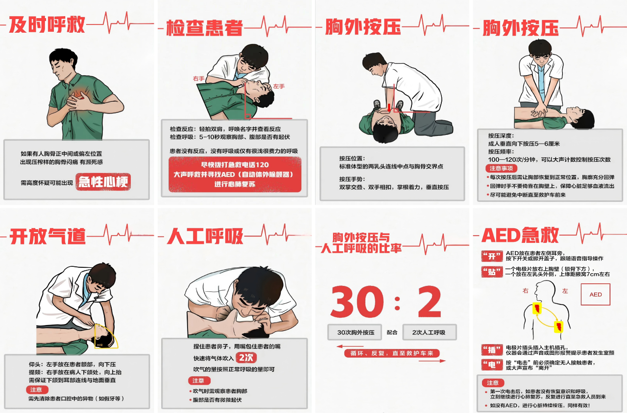 4. 尽早使用AED:自动体外除颤器是抢救心脏骤停患者的“利器”,每延迟1分钟除颤,抢救成功率下降7%—10%,AED操作简单,按照“开、贴、插、放”四步流程,依据语音提示即可完成,非专业人员也能快速上手,放电后需立即继续心肺复苏,直至急救人员抵达。
