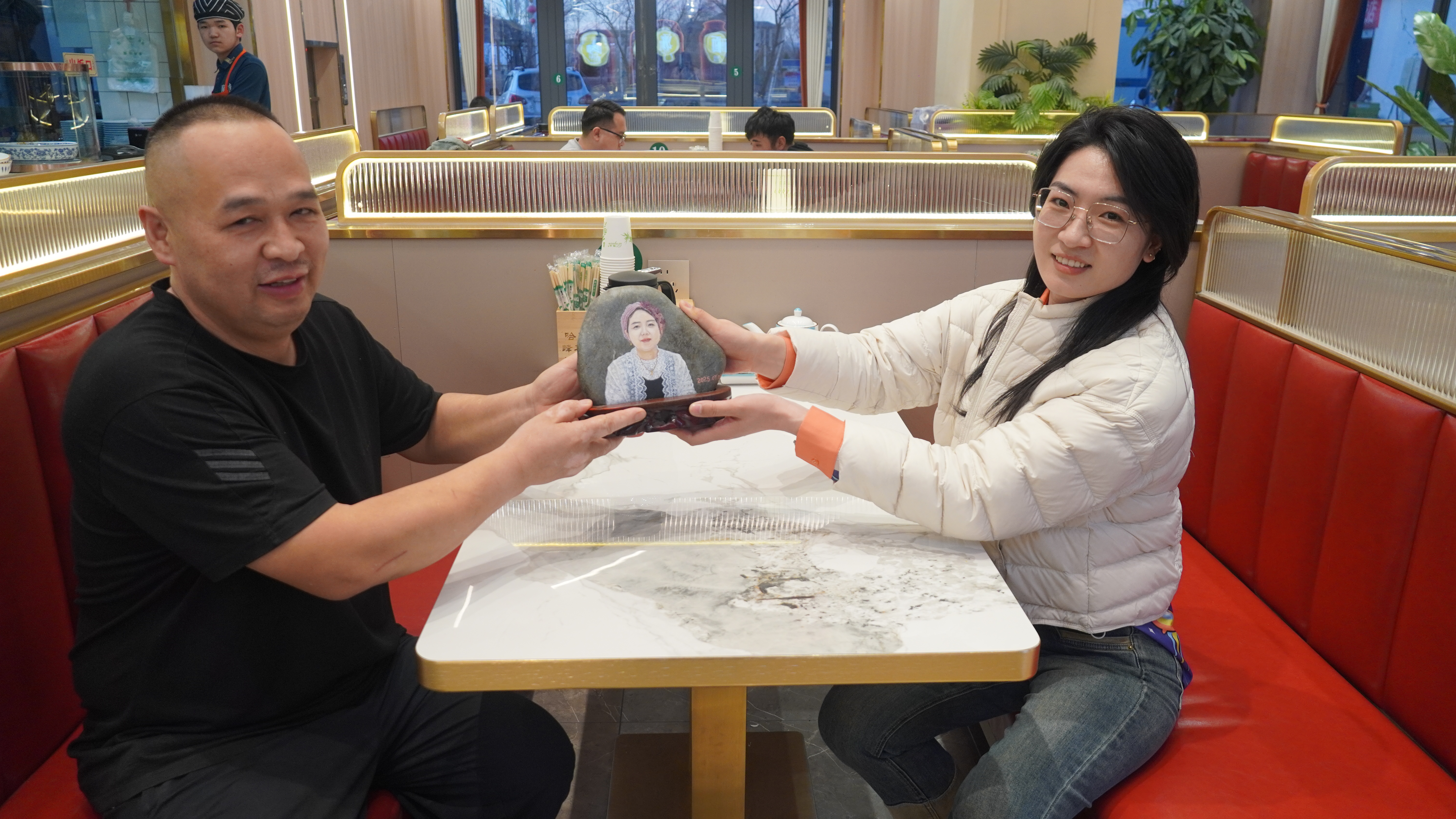 事后,刘莉萍带着绘有马国成家人形象的精致石头画归来,将其作为马国成“请吃饭”的回报。这幅栩栩如生的作品被马国成珍视地摆在店内显眼处,引得食客纷纷打卡拍照,甚至有人开玩笑道:“老板,我可以拿石头和你换饭吗?”小店因此人气攀升,客流与营收显著增长。马国成感慨:“石头画让小店有了温度,让哈巴河县的温情与才气被更多人看见。”