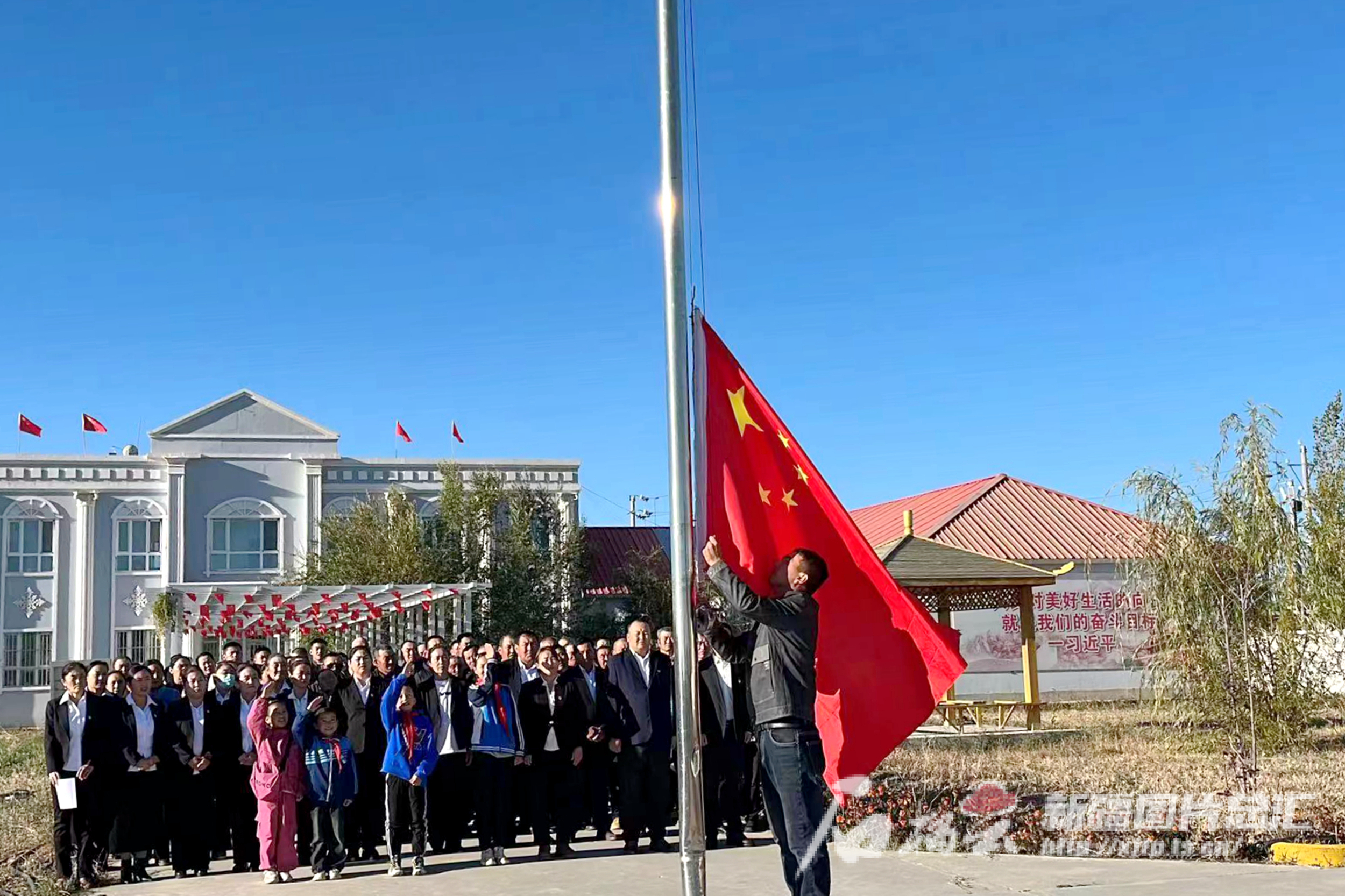 清晨,迎着初升的朝阳,自治区人民政府办公厅驻疏勒县英阿瓦提乡喀拉亚村工作队和该村200余名各族干部群众排成整齐方阵,面向国旗行注目礼、齐唱国歌,庆祝中华人民共和国成立75周年。